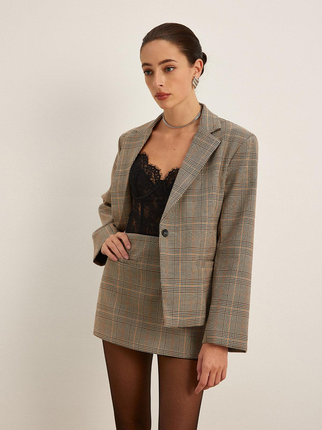Klasik ekose deseni ve oversize kesimiyle dikkat çeken siyah beyaz blazer ceket, modern ve şık...