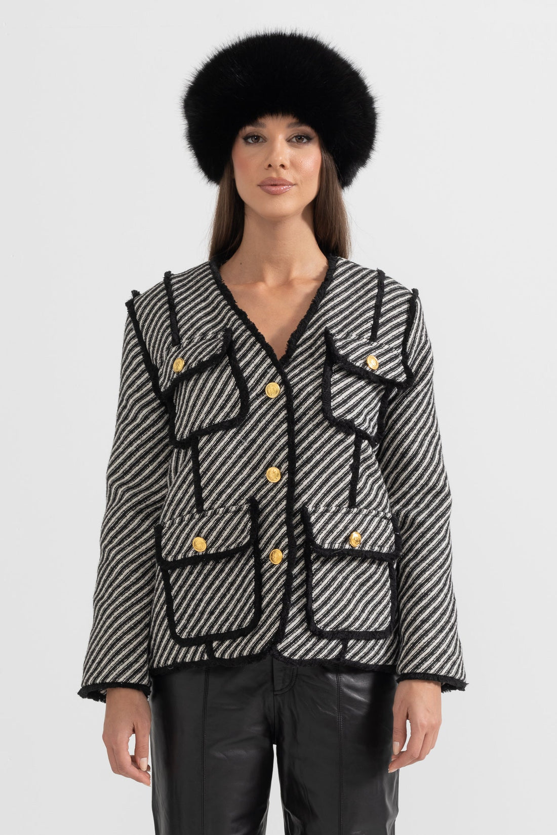 Eşleşen Püsküllü Eşarplı İnce Çizgili Düğmeli Blazer