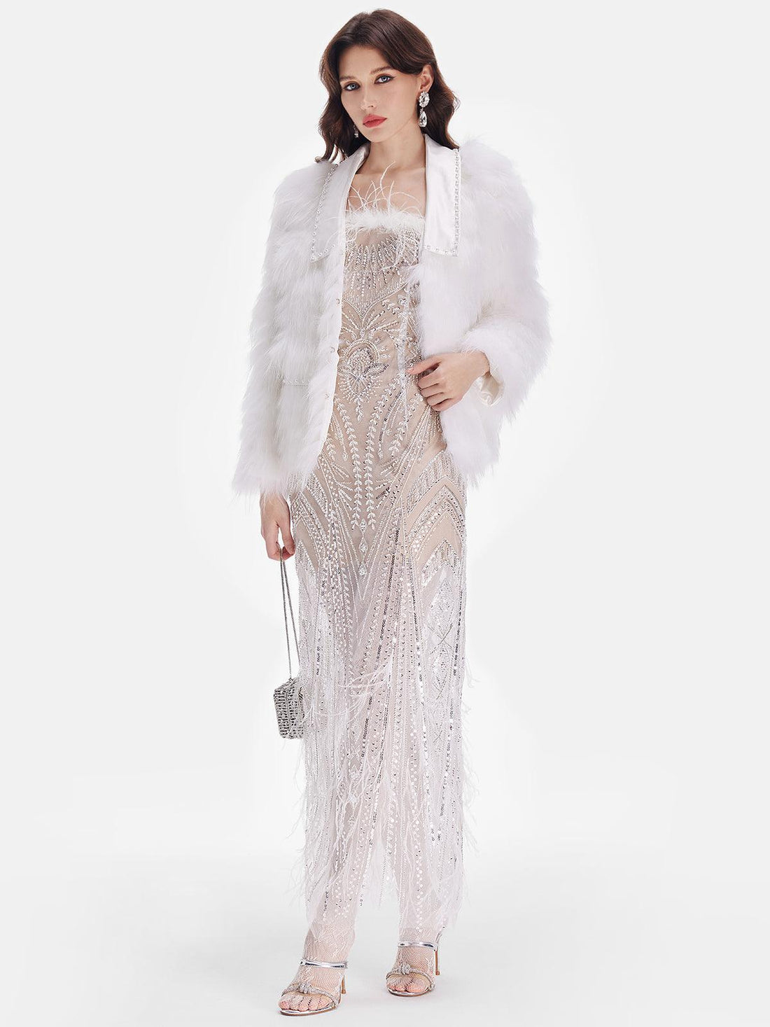 Kristal İşlemeli Beyaz Kürk Ceket