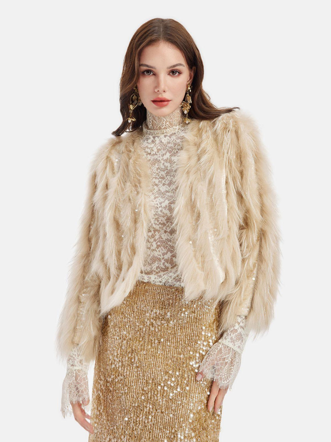 Tüy detaylı ve ışıltılı bu ceket, iddialı ve göz kamaştırıcı bir tarz için mükemmel bir...