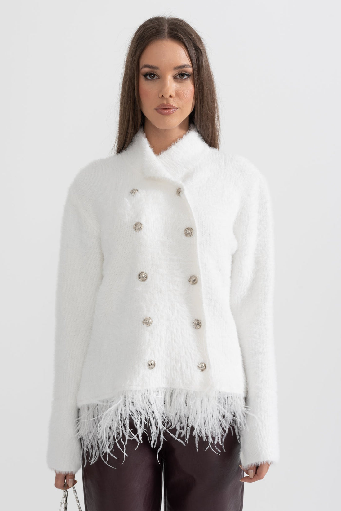 Göz alıcı bir şıklığa sahip olan beyaz tüy detaylı bu ceket, özel davetlerde zarafetinizi tamamlamak...