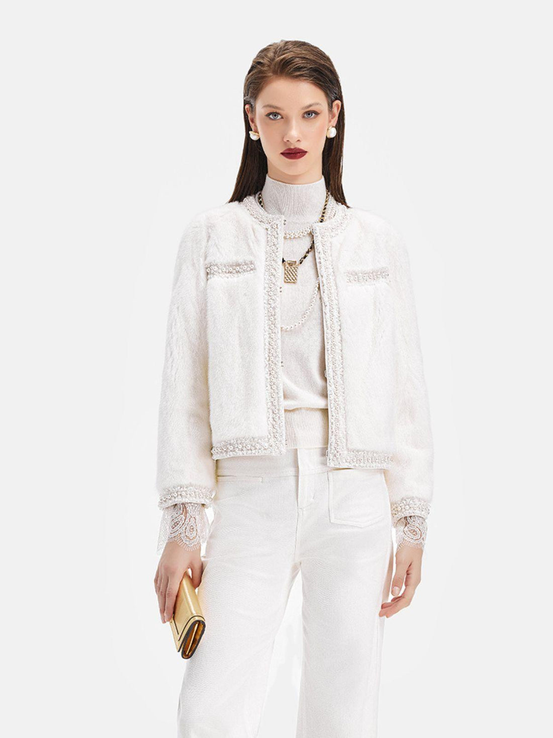 Şıklığın ve sıcaklığın birleşimi bu krem kürk ceket, incili cep detayları ile sofistike bir görünüm...