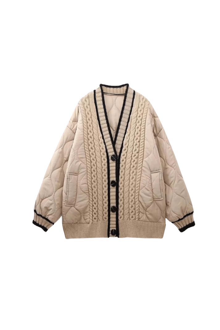 ÜRÜN AÇIKLAMASI -Renk: Krem-Materyal: Polyester-Stil: Triko detaylı düğmeli kapitone ceket-Detaylar: Uzun kollu, düşük omuzlu, örgü...