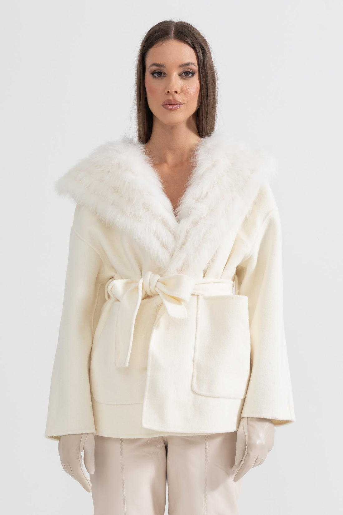 Ürün Açıklaması Zarif ve lüks bir görünüm sunan bu off-white kaşmir palto, oversize tilki kürkü...