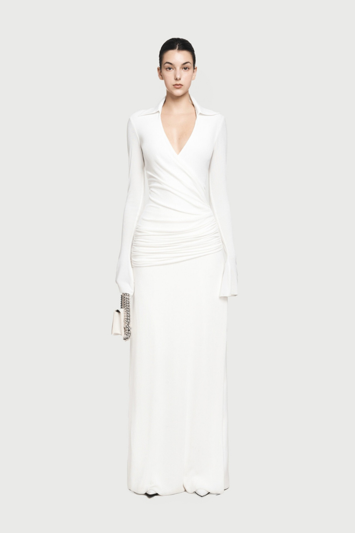 Saf beyazın zarafetini modern bir silüetle buluşturan bu maxi elbise, sofistike ve iddialı bir görünüm...