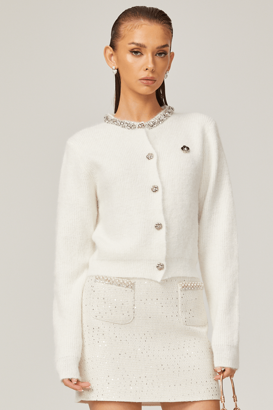 "Crystal Charm" hırka, zarif taş işlemeleri ve yumuşak dokusuyla sofistike bir stil sunar. İnci detaylı...