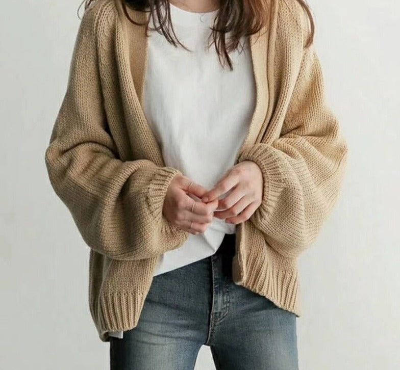 Soğuk günlerde sıcacık bir konfor sunan oversize bej triko hırka, minimalist tasarımı ve rahat kesimiyle...