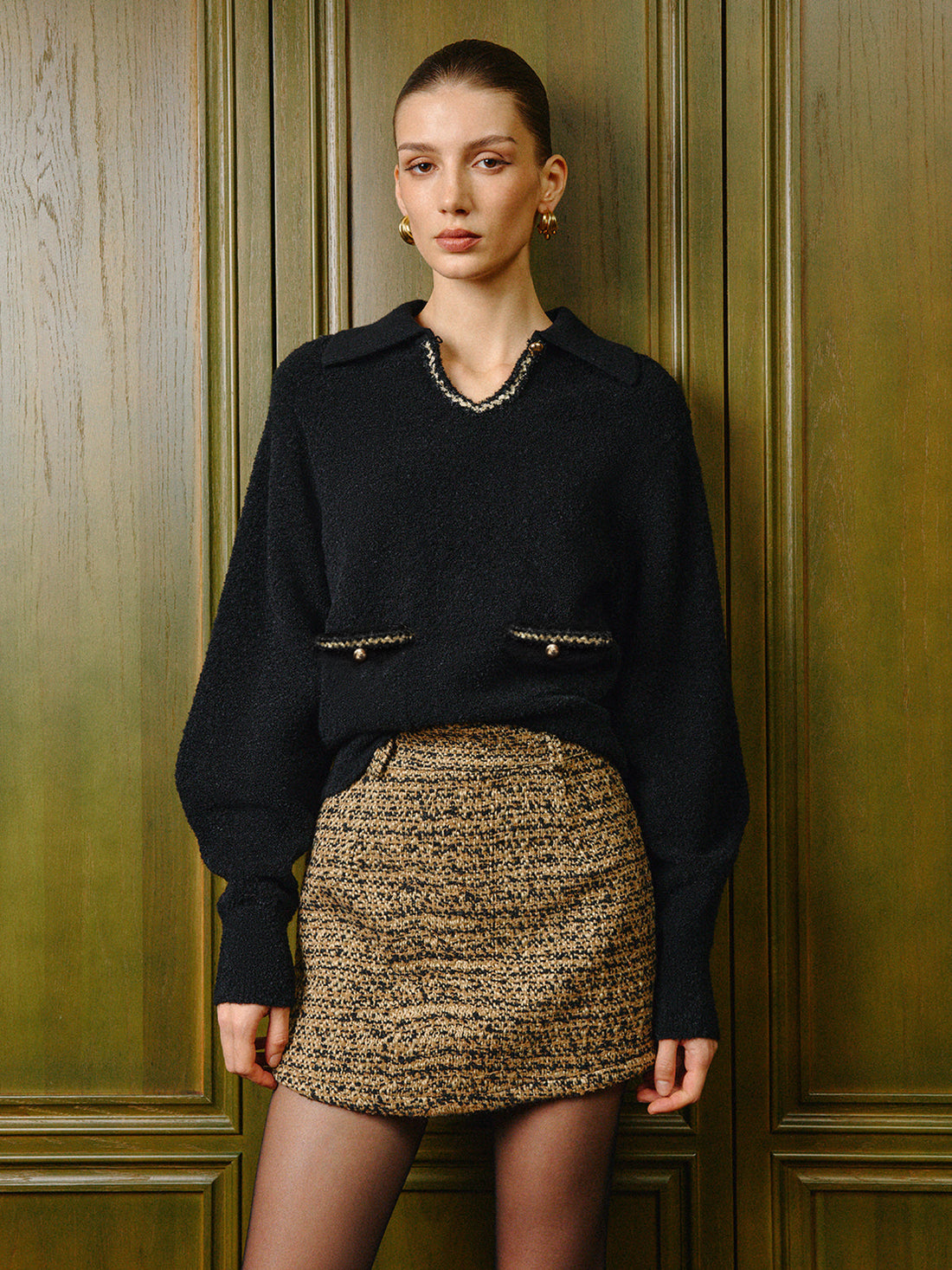 Yün Karışımlı Kontrast Biye Nervürlü Örgü Üst