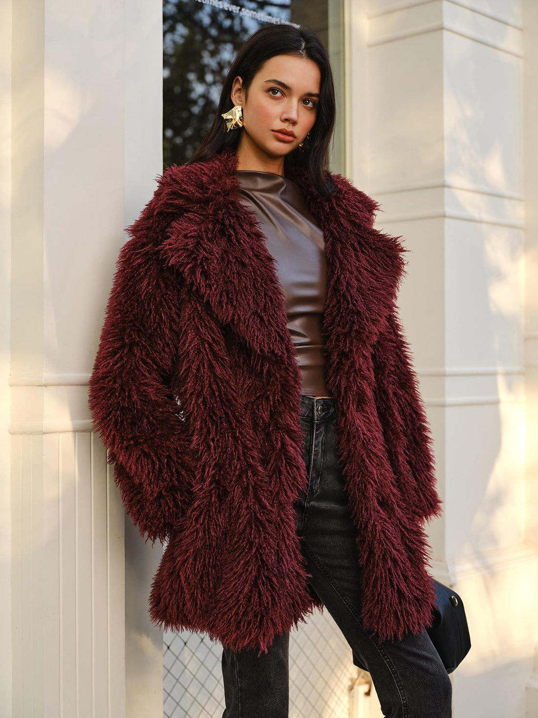 Yumuşak dokusu ve bordo rengiyle lüks bir görünüm sunan bu tüylü kürk ceket, kış stilinizi...