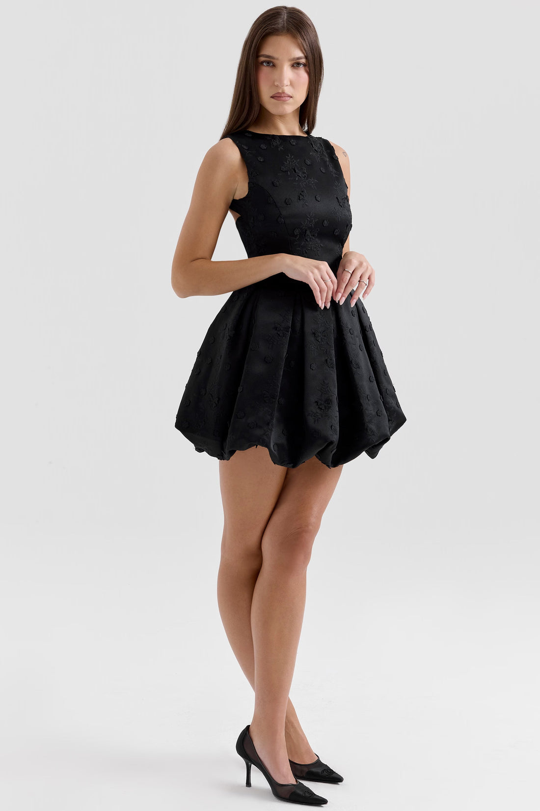 Melika Siyah Sırtı Açık İşlemeli Mini Puf Elbise
