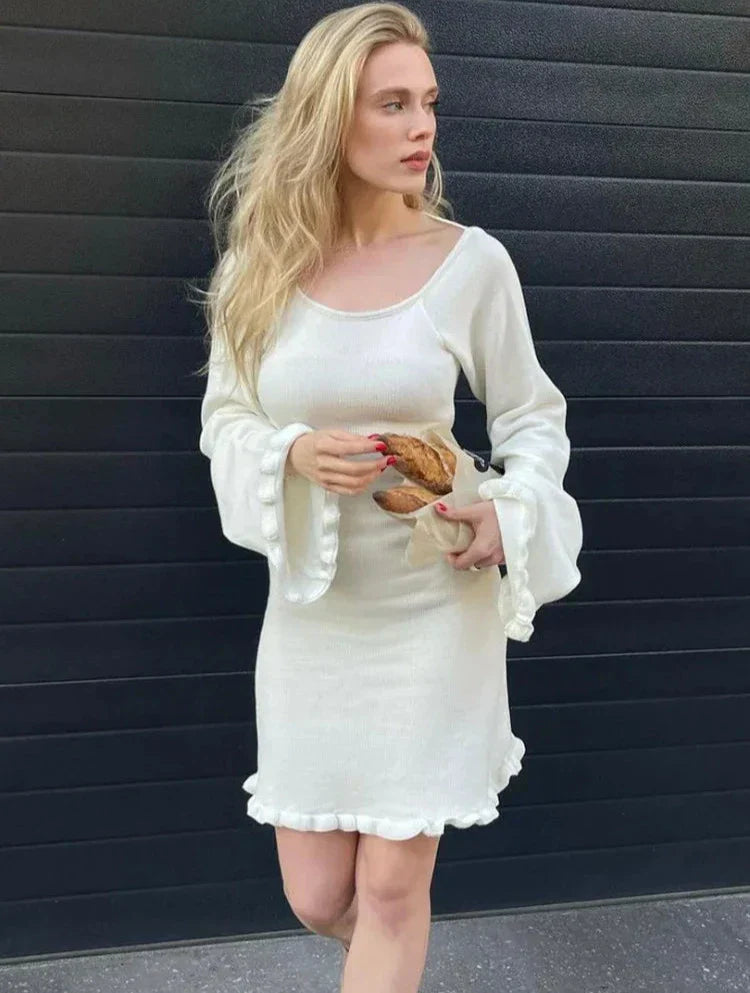 Minimalist çizgileriyle öne çıkan beyaz triko mini elbise, zarif ve sade şıklığı bir araya getiriyor....