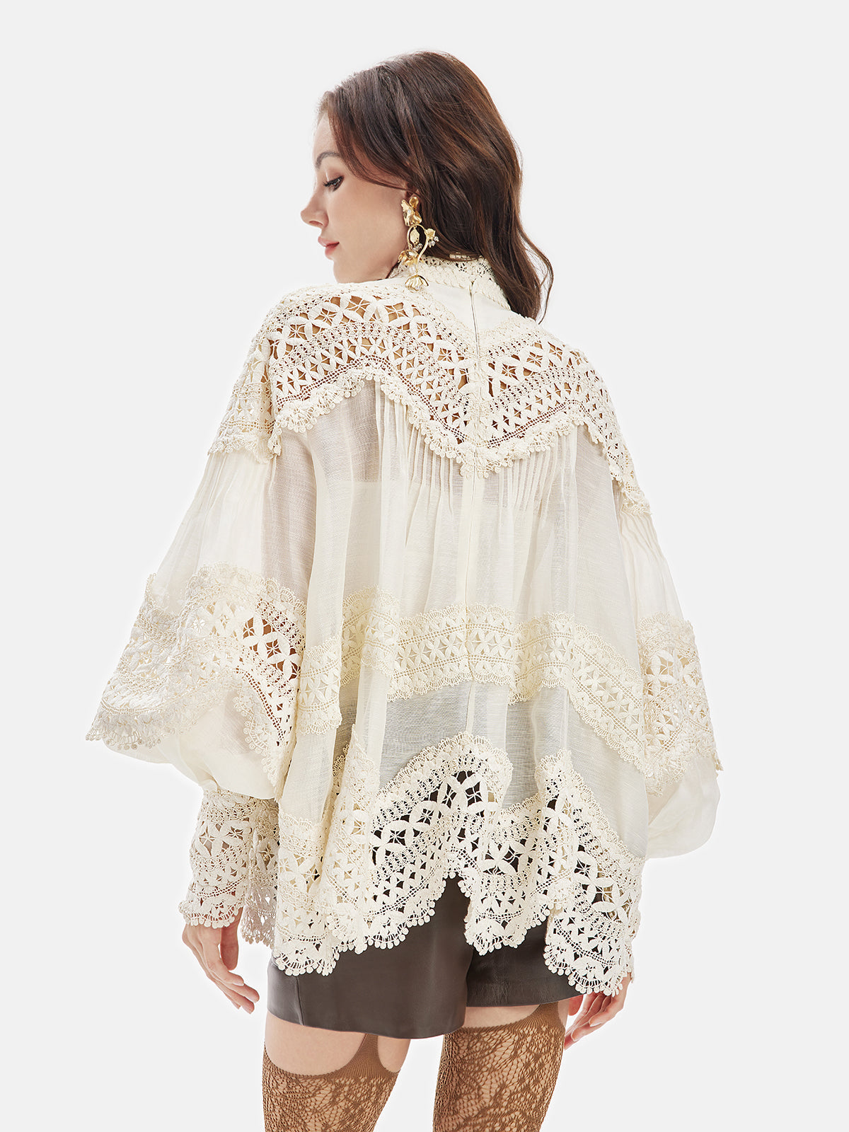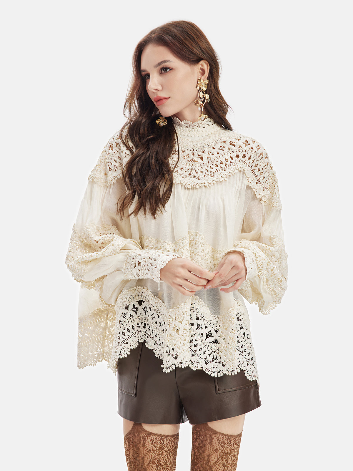 Lantern Blouse with Embroidered Sleeves and Lace