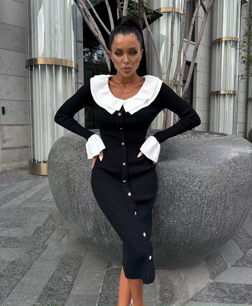 This elegant midi dress, with its vintage influences, features a plunging V-neck, long, fitted sleeves, and gold-toned buttons at the front for a sophisticated look. Crafted from rib knit jersey, the piece is detailed with a contrasting ruffled collar and flared cuffs.