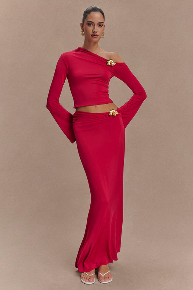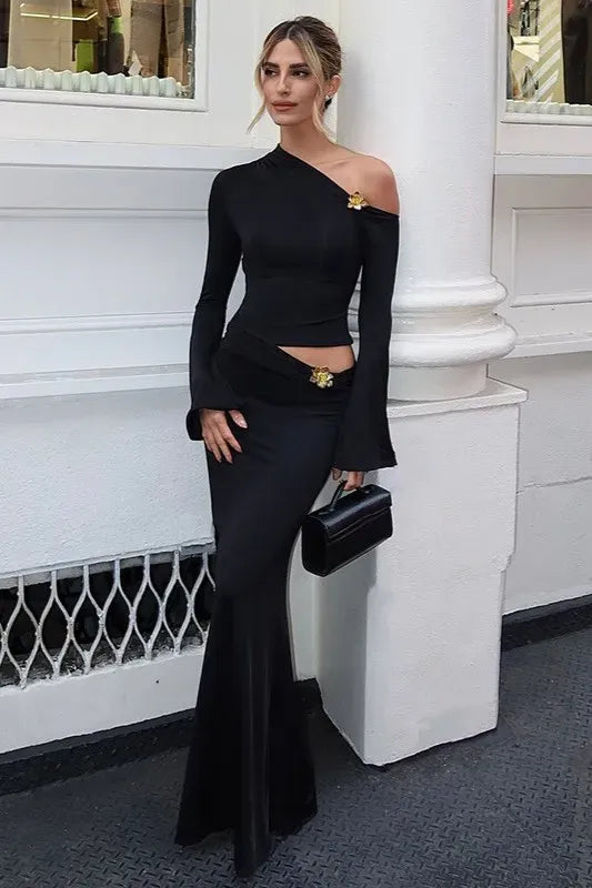 Modern ve feminen çizgilerin buluştuğu bu takım, özel davetler için kusursuz bir seçim. Tek omuzlu asimetrik bluz ve vücuda oturan maxi etekten oluşan takım, altın çiçek aksesuar detaylarıyla şıklığınıza ışıltı katıyor. İddialı ama aynı zamanda zarif görünmek isteyenler için tasarlandı.