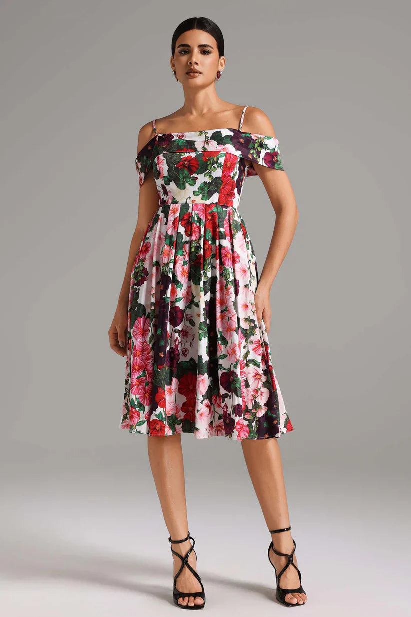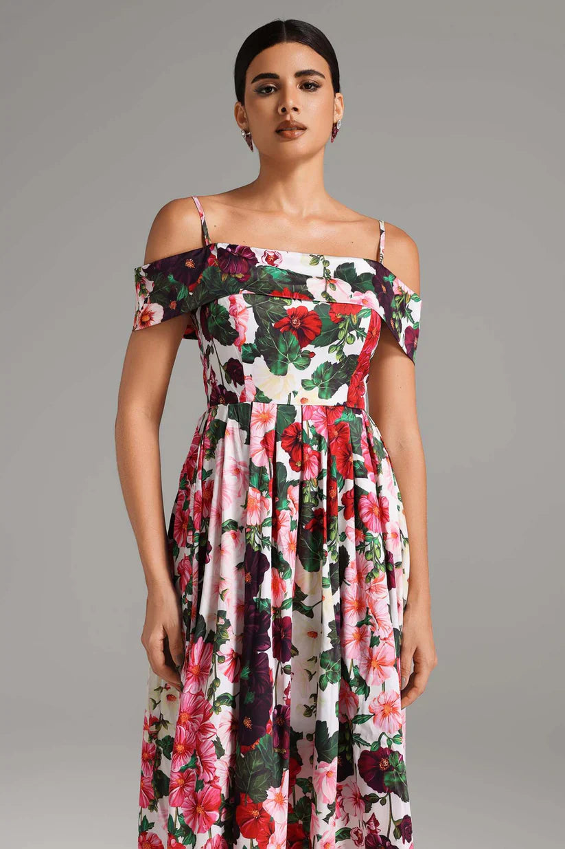 Alianora Omuz Açık Çiçekli Midi Elbise