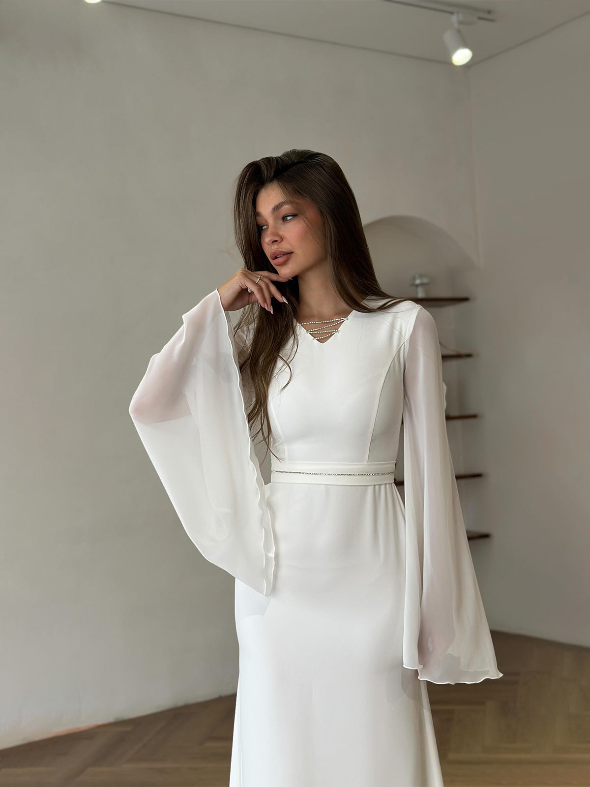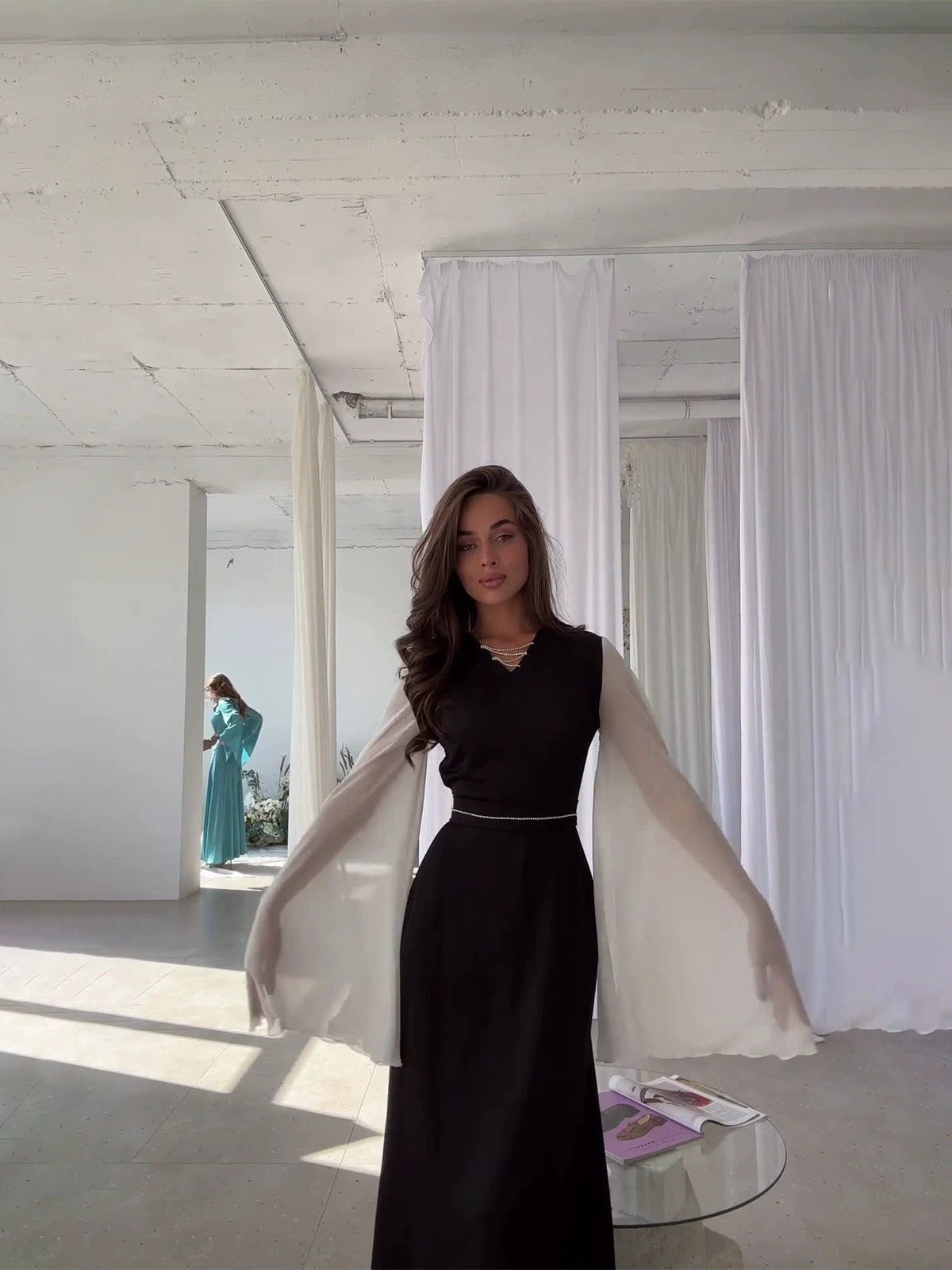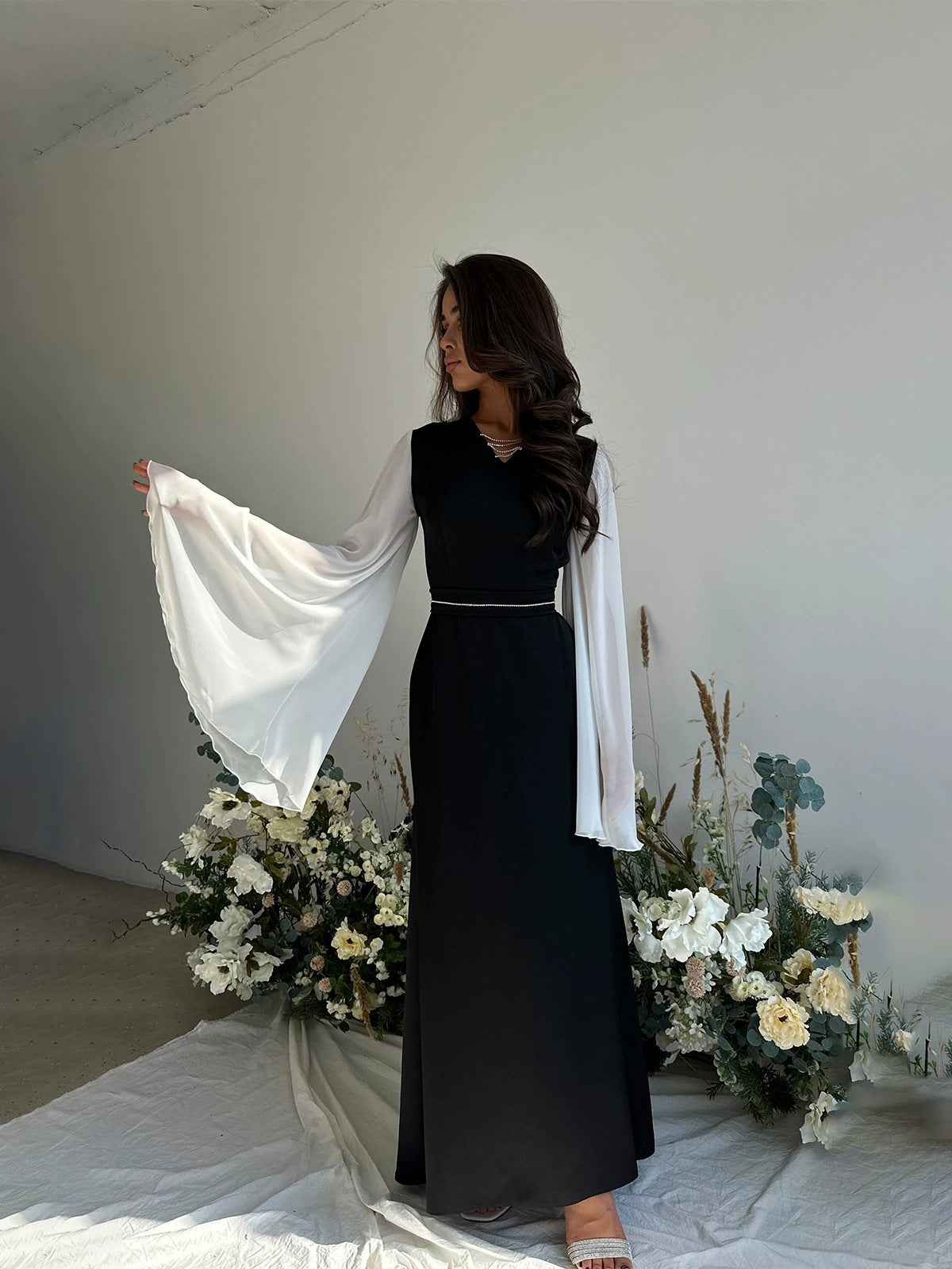 Şifon detaylı uzun kollu elbise, hem tam beyaz hem de siyah üzerine beyaz kollu seçenekleriyle sizlerle.