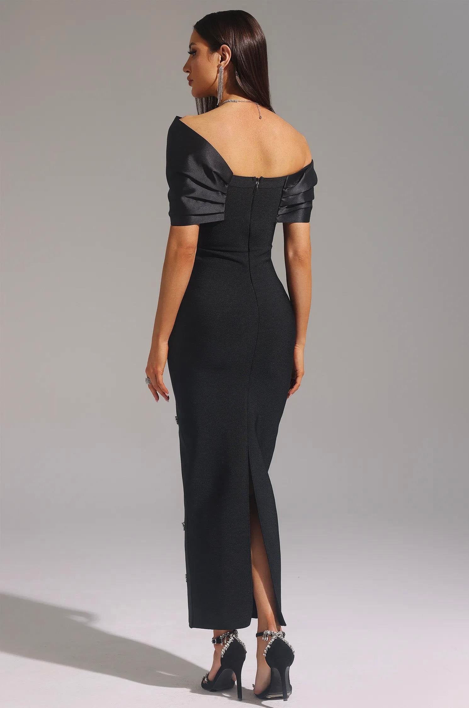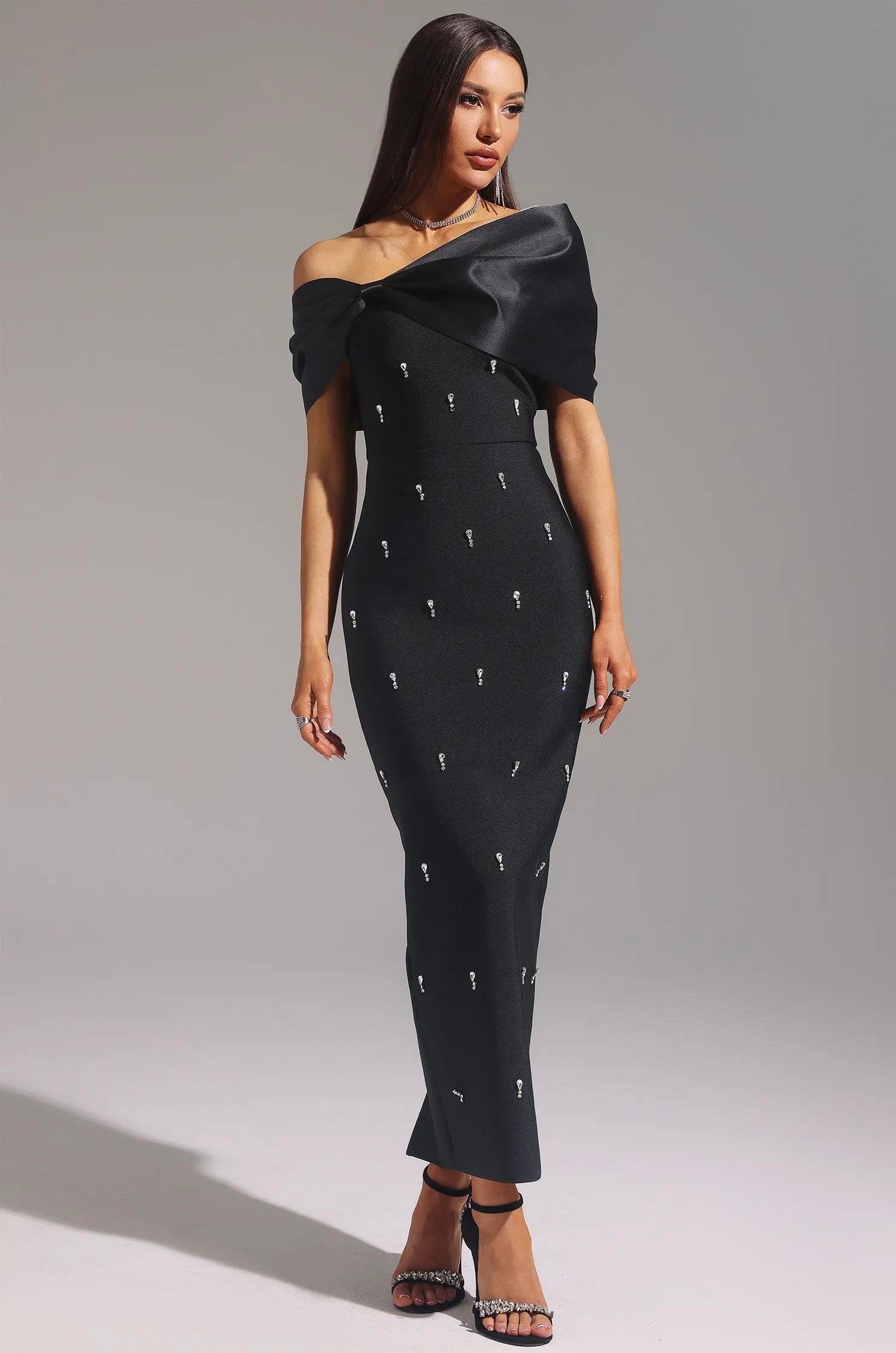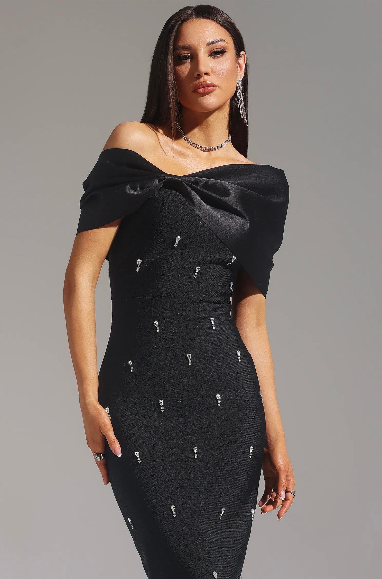 ✨ Bu siyah midi abiye elbise ile tüm gözleri üzerinize çekin! 🤩 Omuzları açık straplez yaka kesimi ve omuzlardaki saten kurdele detayı, modern ve şık bir görünüm sunar. ✨ Elbisenin üzerindeki kristal taş işlemeleriyle her an parlayın. 🖤💖