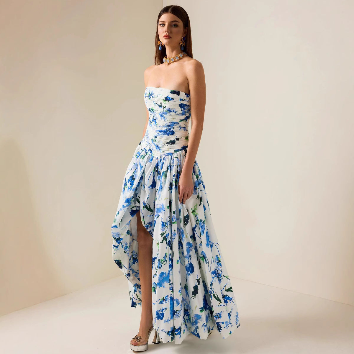 Alisora Straplez Mavi Çiçek Desenli Yırtmaçlı Şifon Elbise