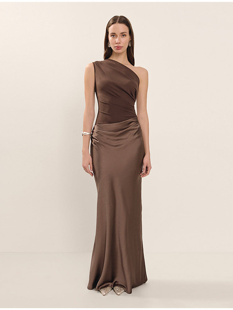 Bu kahverengi tek omuz saten abiye elbise, vücudu mükemmel şekilde saran balık kesimi ve zarif drape detaylarıyla her ortamda göz alıcı bir duruş sunar. Akıcı saten dokusu, ışığı yansıtarak size sofistike bir ışıltı kazandırır.