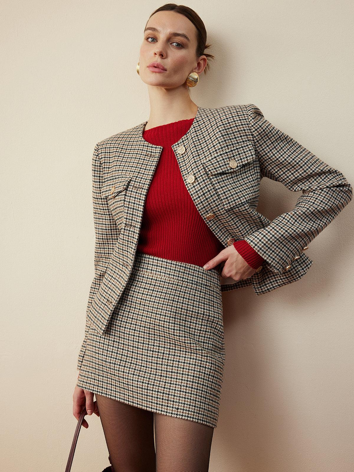 Klasik ekose deseni ve altın düğme detaylarıyla dikkat çeken bu ceket ve zamansız bir şıklık sunuyor. Günlük stilinize sofistike bir dokunuş katacak eşsiz bir kombin!