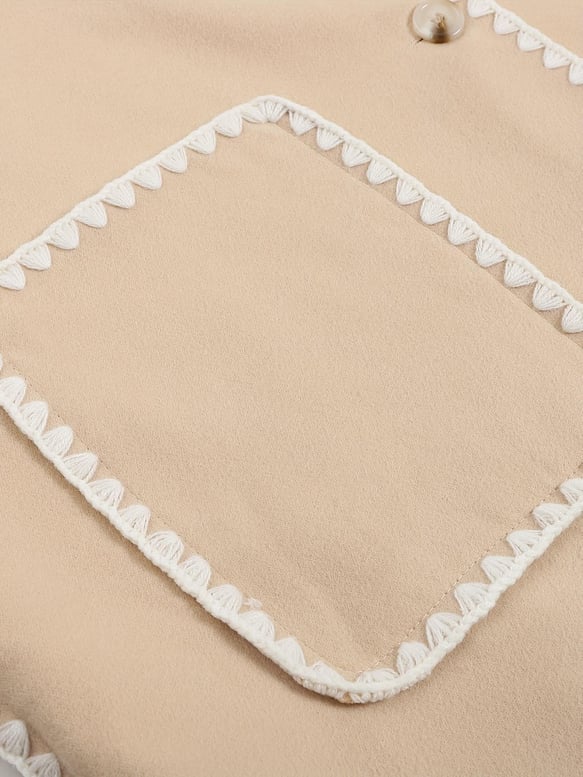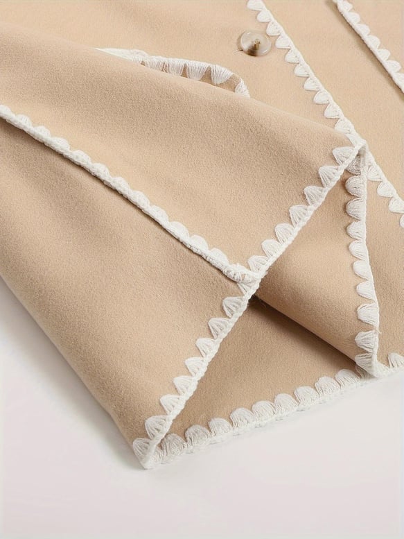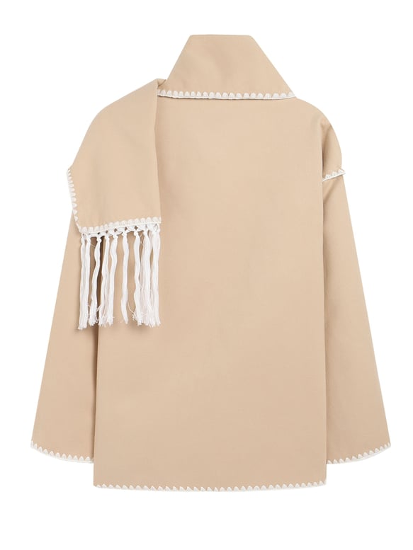 Şal ve püskül detaylı, kontrast biyelerle öne çıkan kaban.