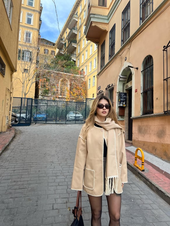 Modern çizgilerle yeniden yorumlanan püskül detaylı kaban, zarif ve sofistike bir stil sunuyor. Kontrast beyaz biyeler, tasarıma farklı bir dinamizm katarken, eklenmiş şal detayı hem fonksiyonel hem de estetik bir dokunuş sağlıyor. Soğuk havalarda şıklığını ön plana çıkarmak isteyenler için ideal bir seçim.