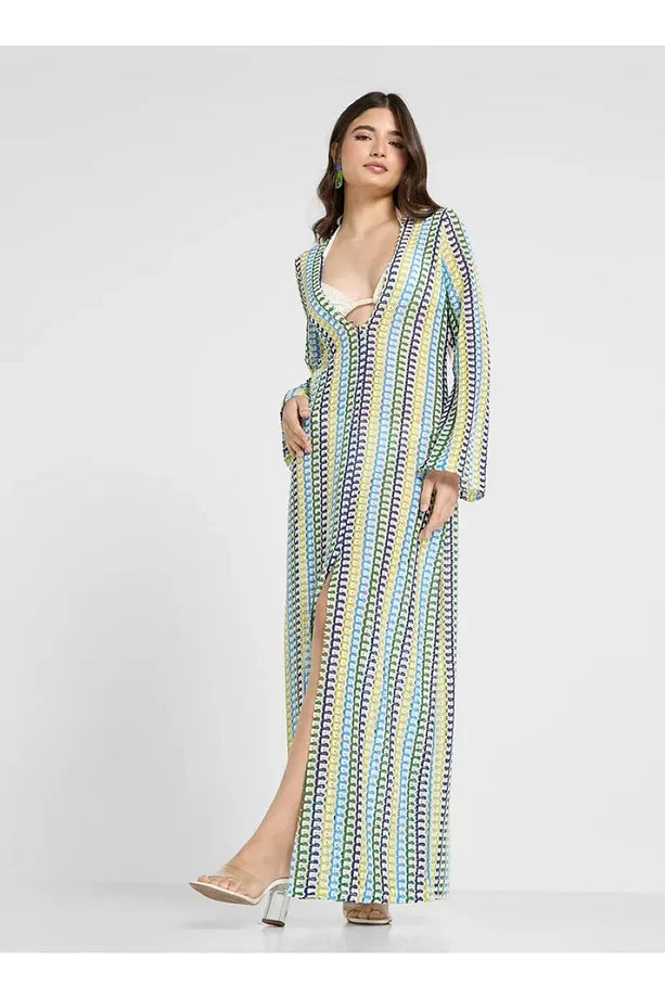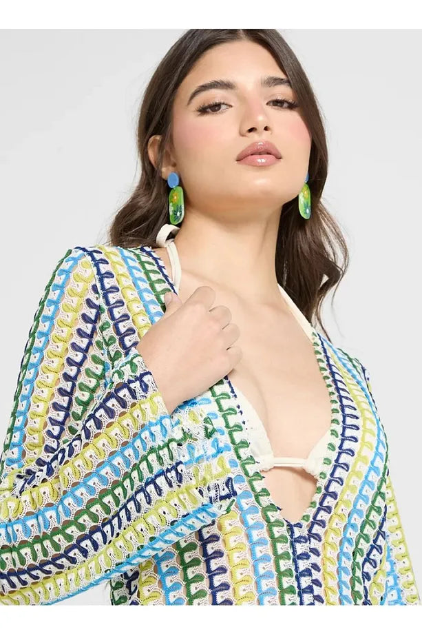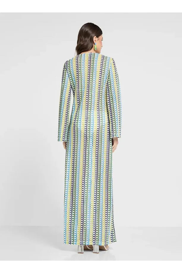 Boho V Yaka Çan Kollu Dalgalı Çizgili Tığ İşi Plaj Tatil Uzun Elbise