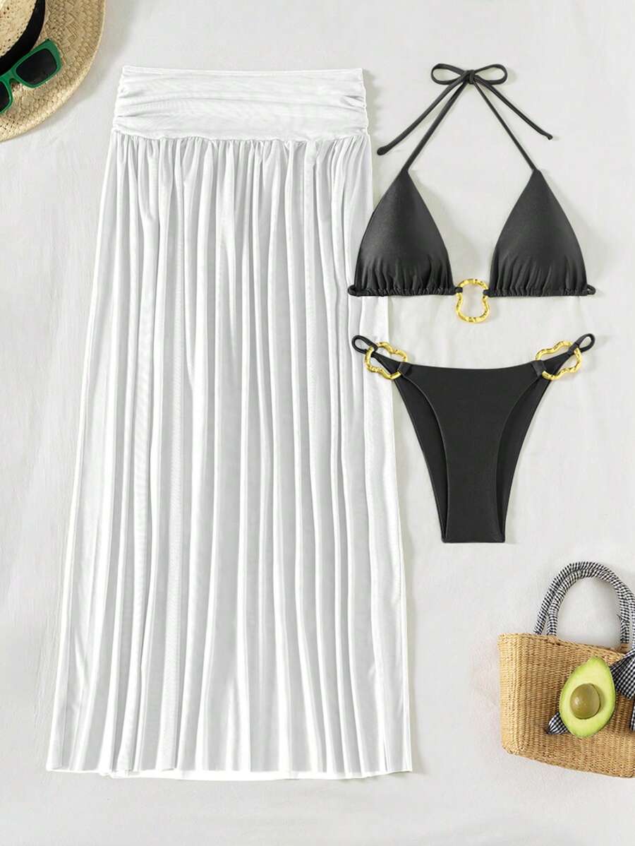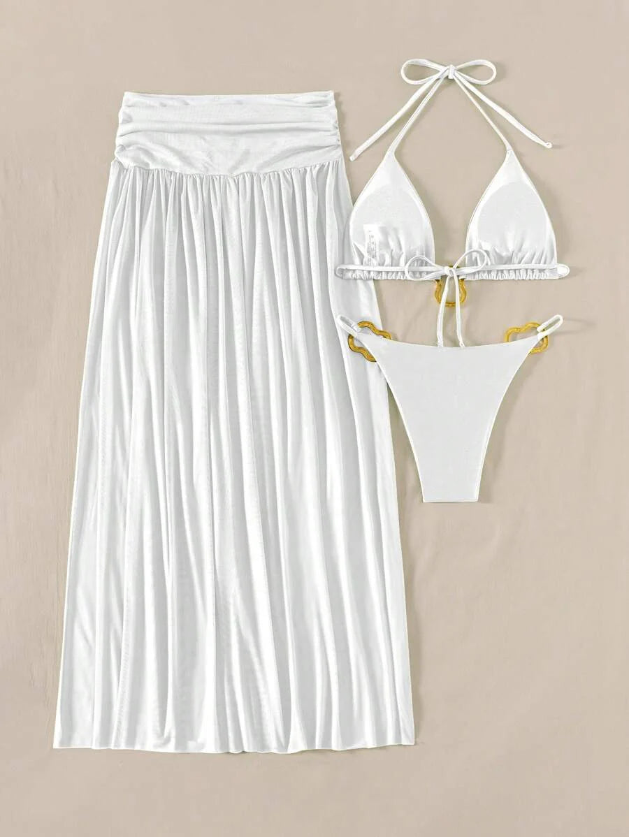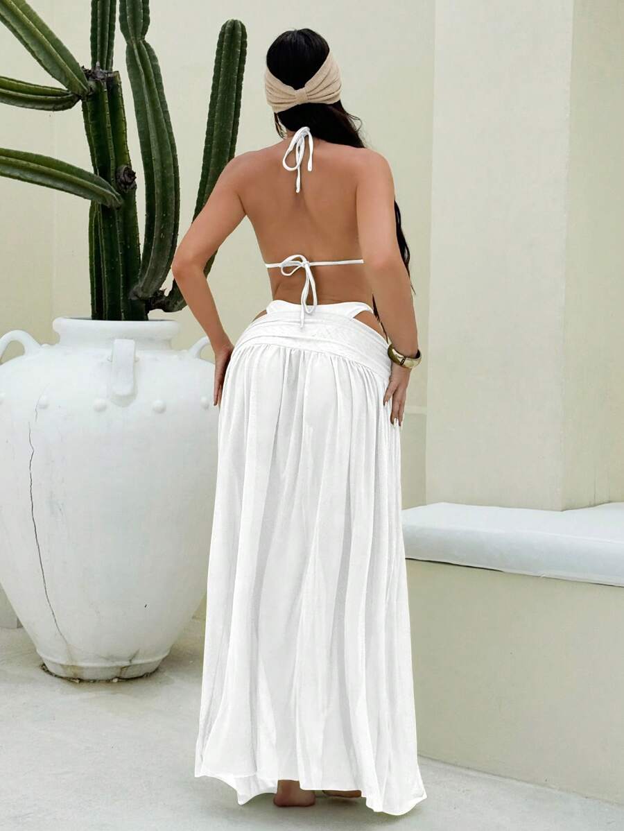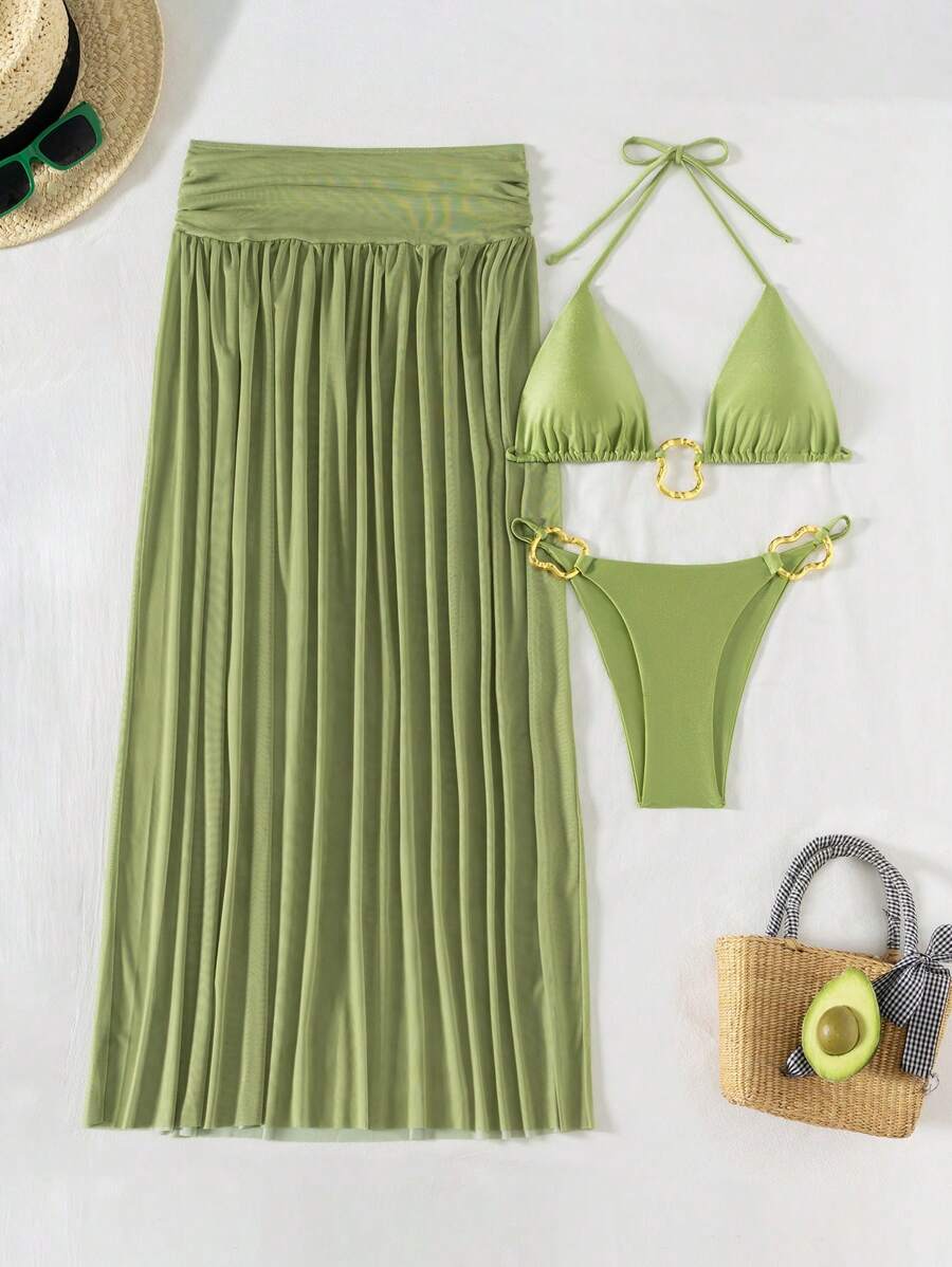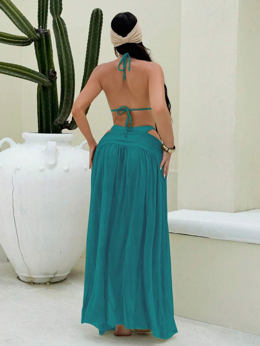 Parlak Kumaş Boyundan Bağlamalı Bikini, Asimetrik Halka Detaylı Uzun File Plaj Elbisesi