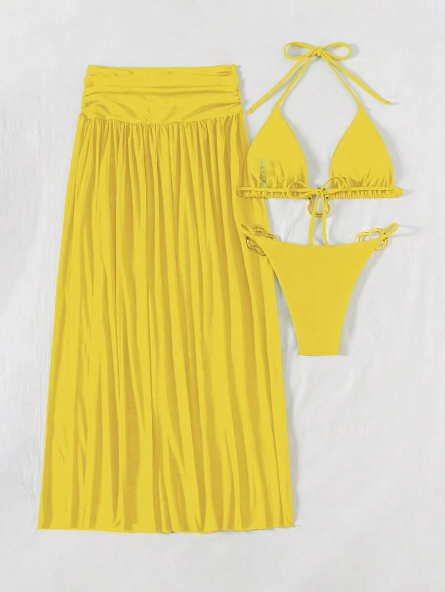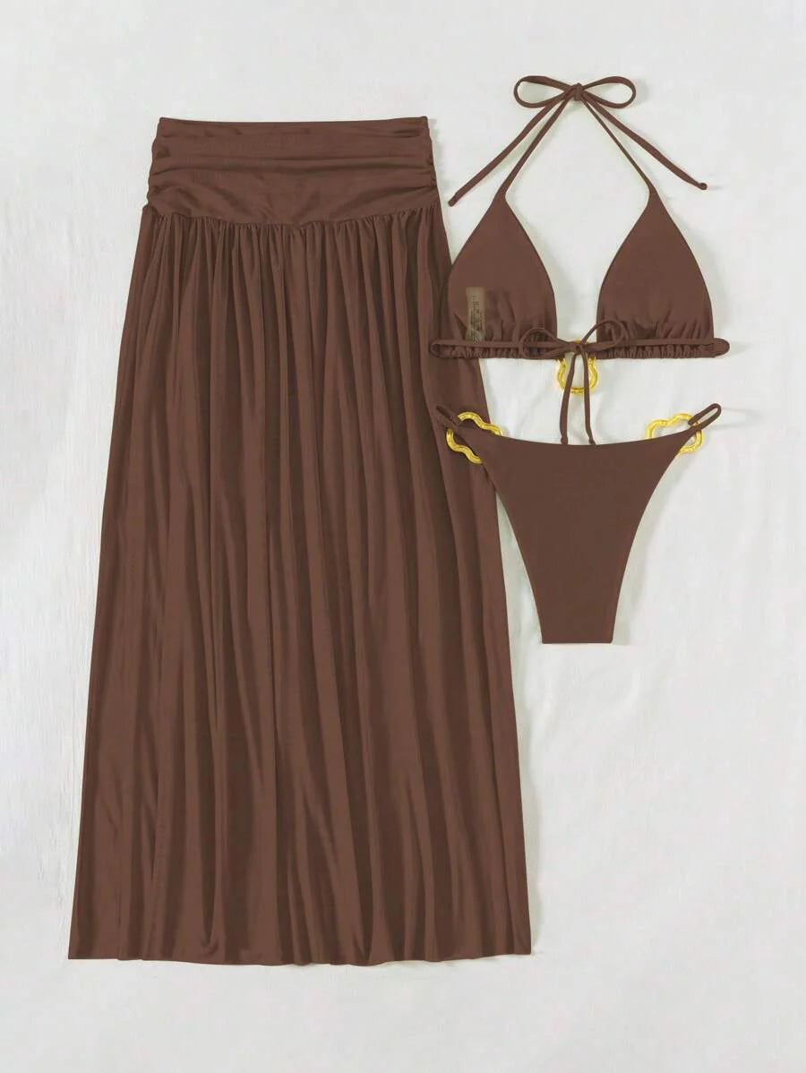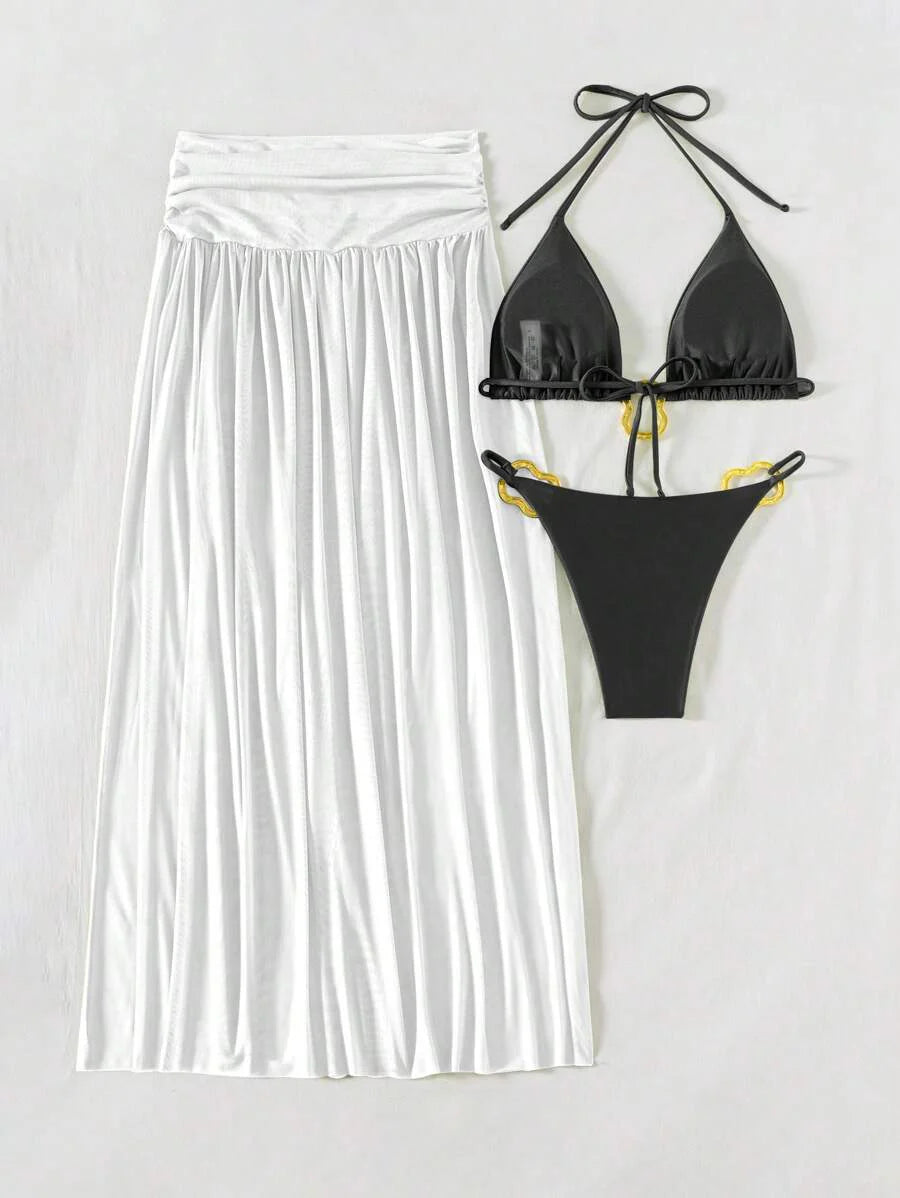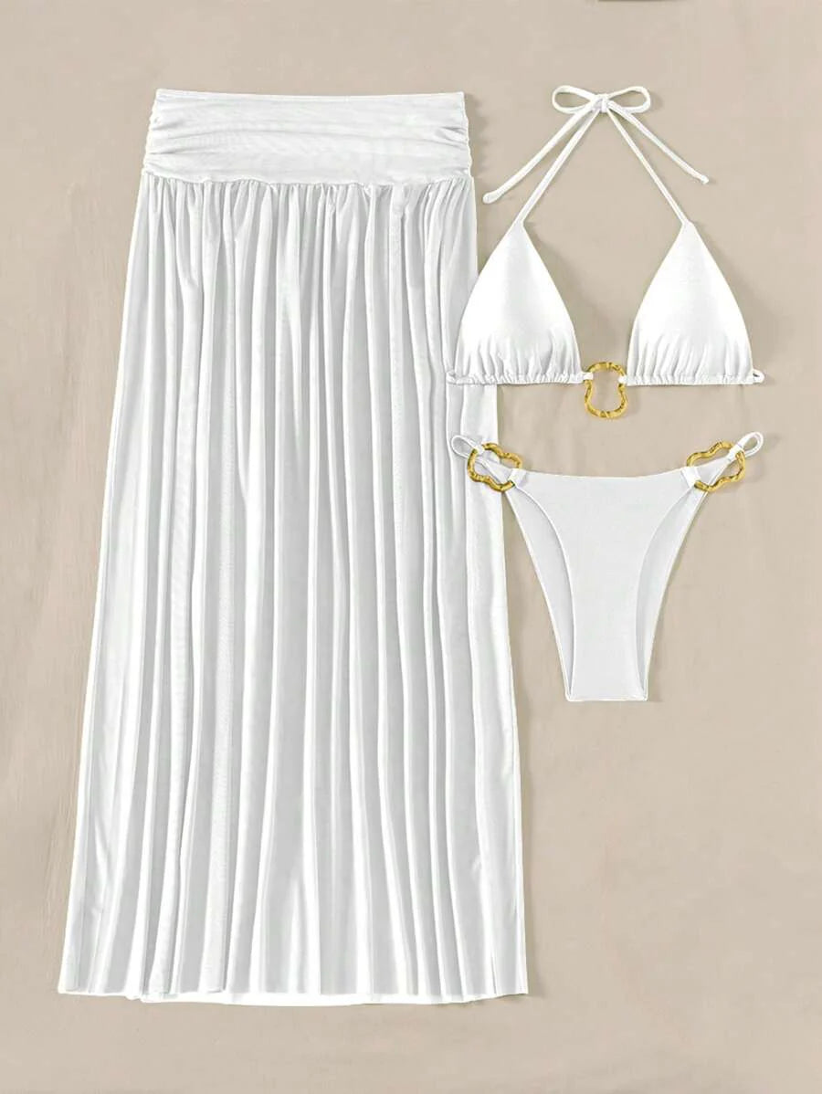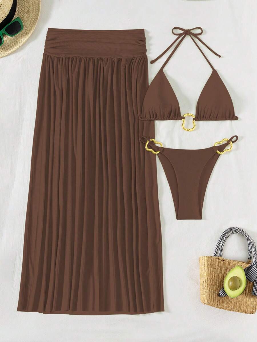 Parlak Kumaş Boyundan Bağlamalı Bikini, Asimetrik Halka Detaylı Uzun File Plaj Elbisesi