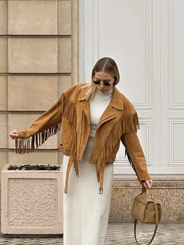 Bu Kahverengi Püsküllü Süet Ceket, modayı yakından takip eden kadınlar için zarif ve şık bir tasarıma sahiptir.