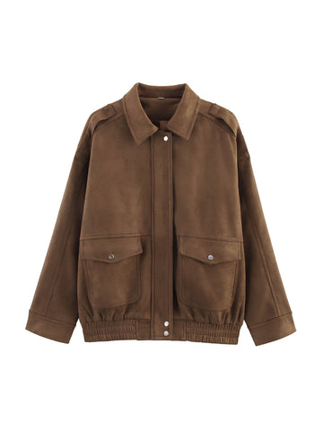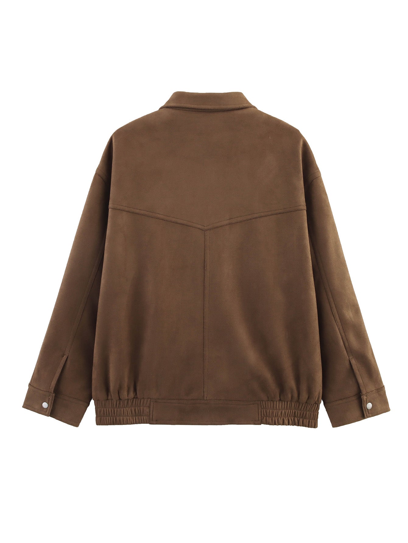 Modern şehir stiline uygun tasarımıyla dikkat çeken bu süet görünümlü ceket, hem şıklık hem de rahatlık sunar. Büyük cepleri ve elastik etek ucu sayesinde fonksiyonel bir kullanım sağlarken, kahverengi tonu her kombine kolayca uyum sağlar.