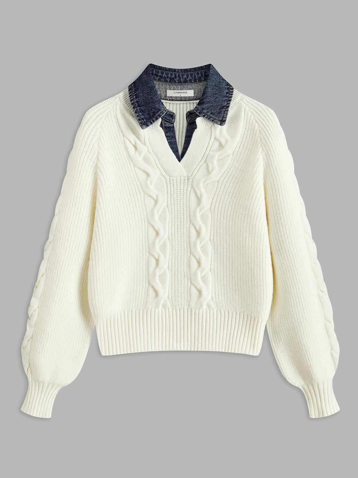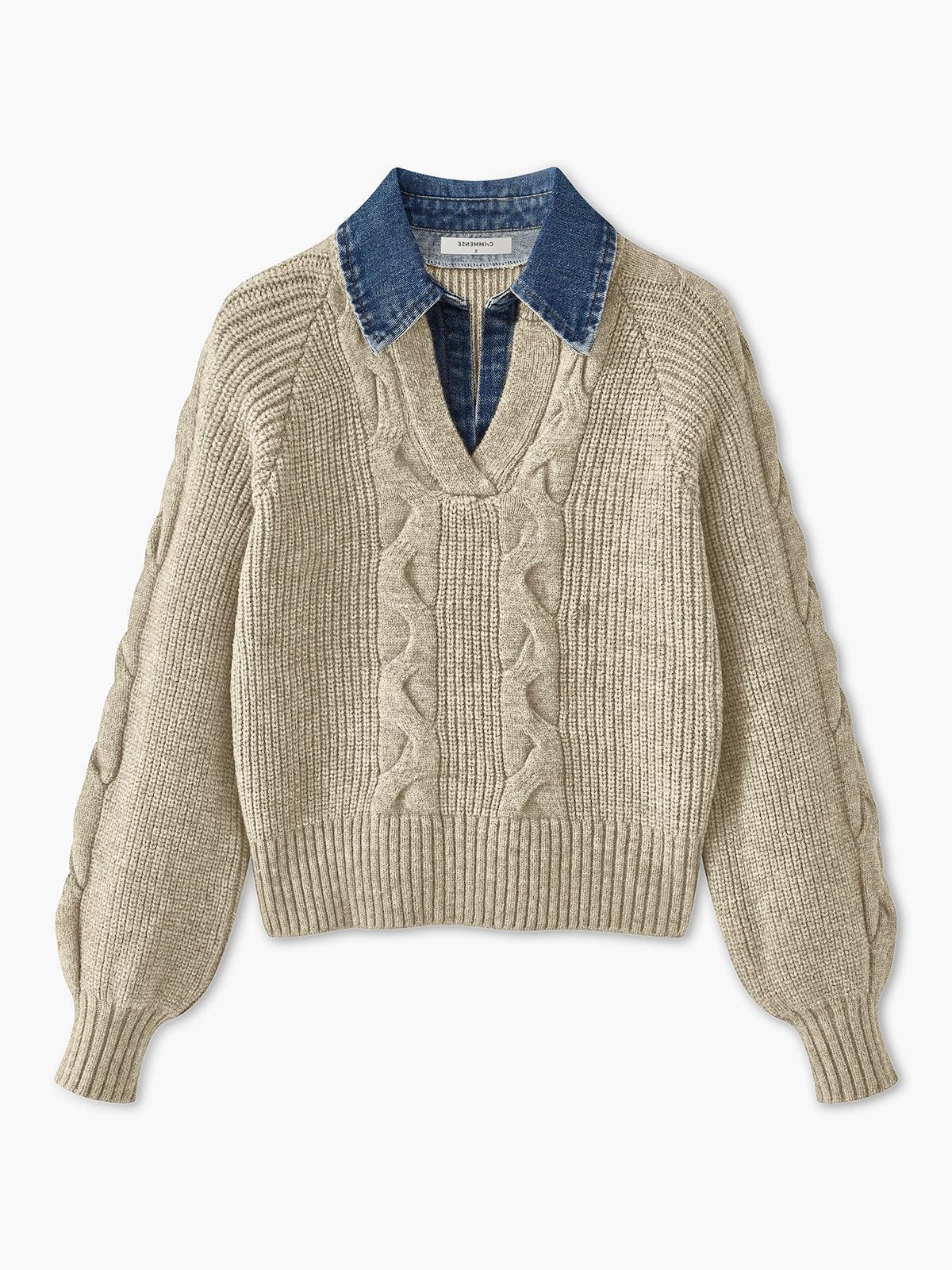 Denim Yakalı Örgü Detaylı Gri Kazak