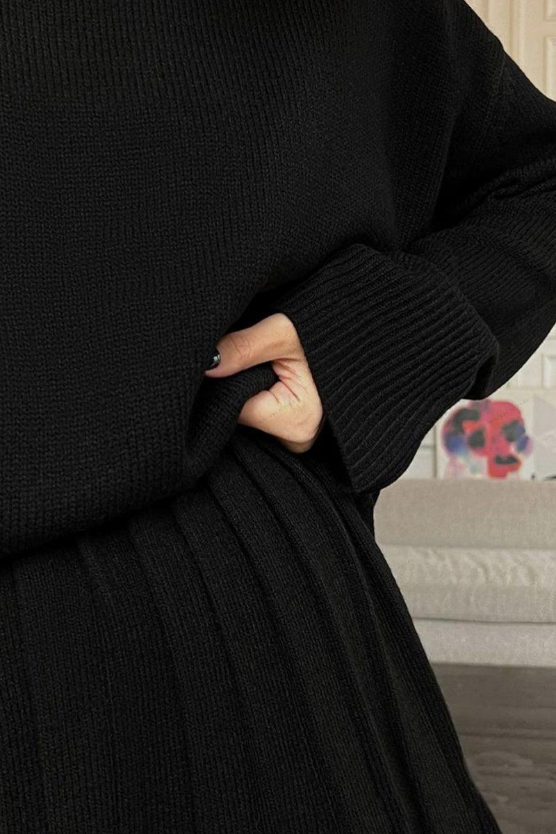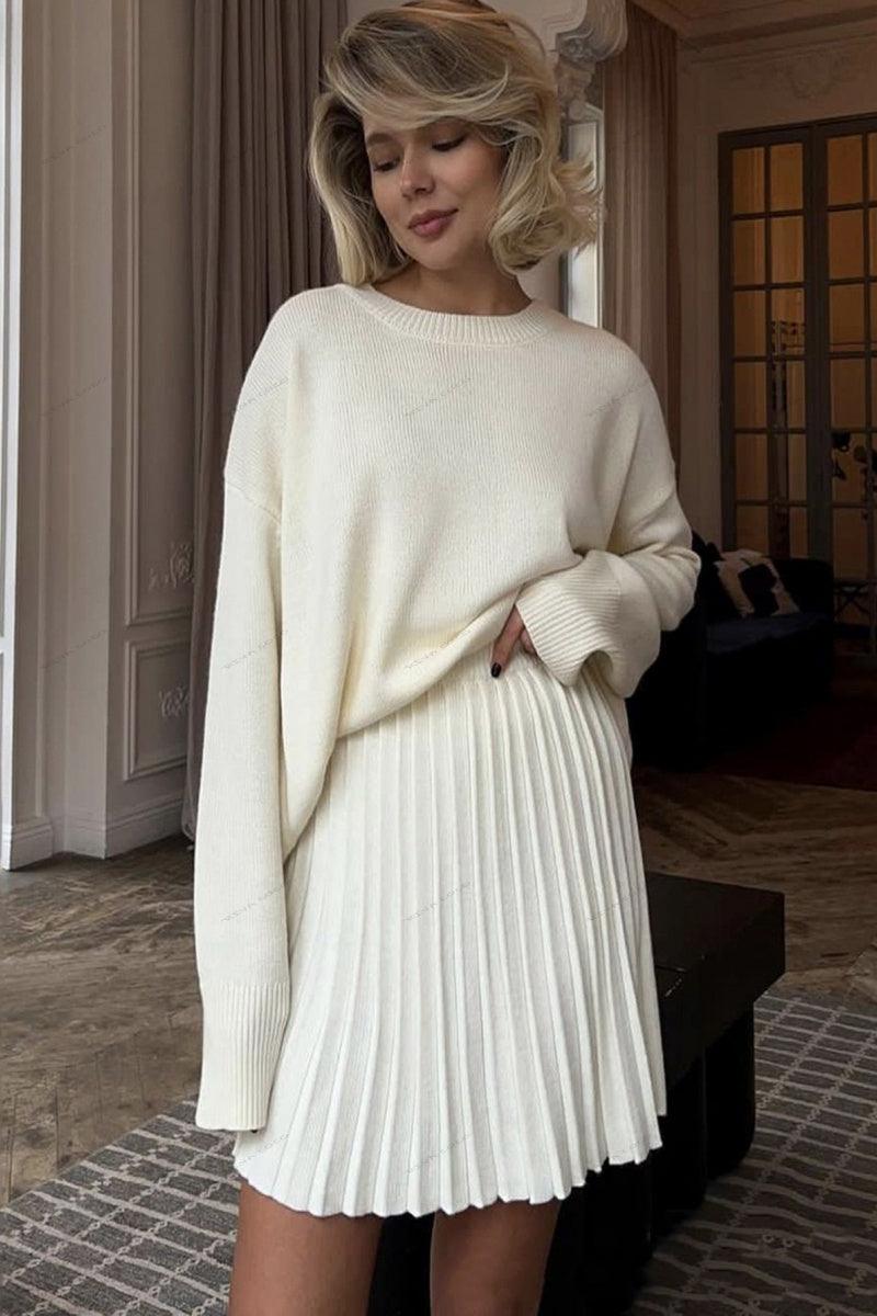 Düz Renk Kazak Yuvarlak Yaka Kazak ve Pileli Etek Takımı