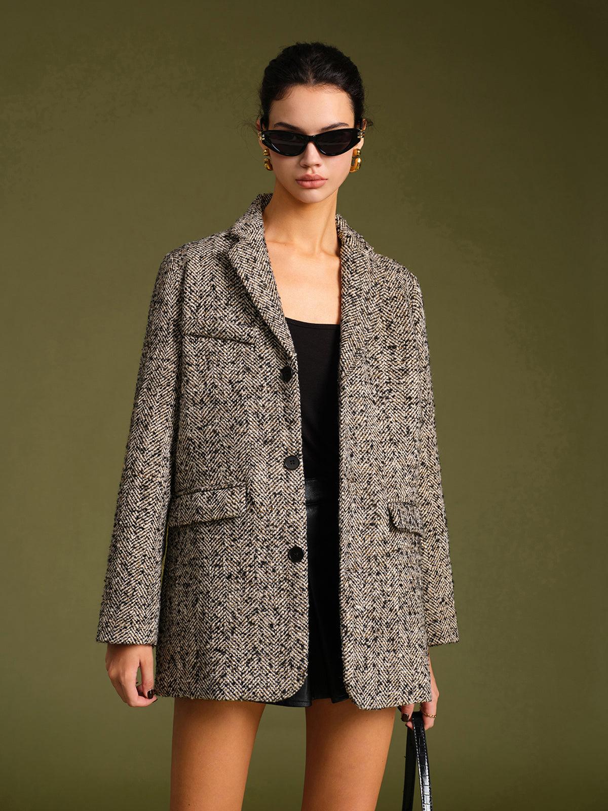 Ekru Balık Sırtı Desenli Kemerli Blazer Ceket