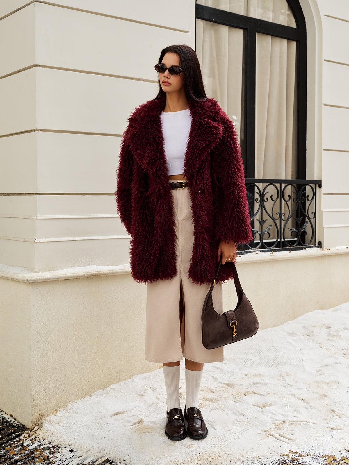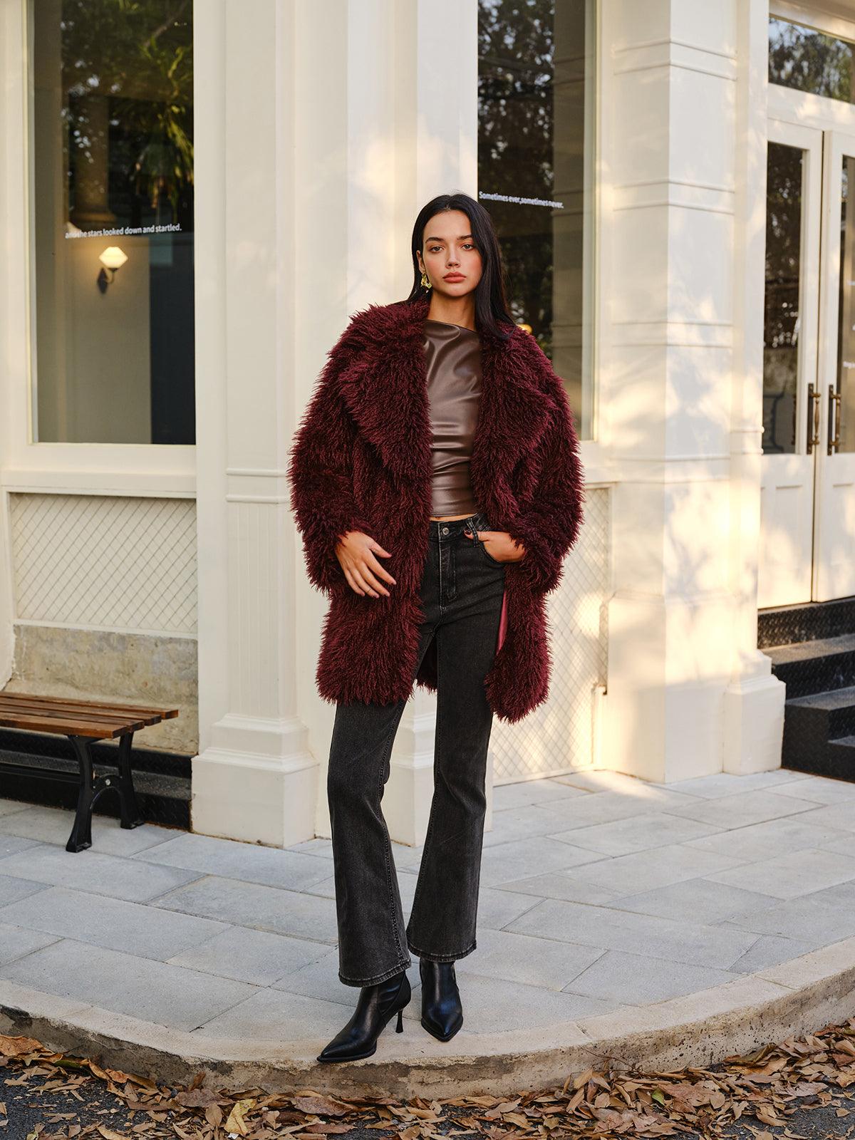 Yumuşak dokusu ve bordo rengiyle lüks bir görünüm sunan bu tüylü kürk ceket, kış stilinizi yükseltecek bir parça. Hem casual hem de özel kombinler için göz alıcı bir seçim!