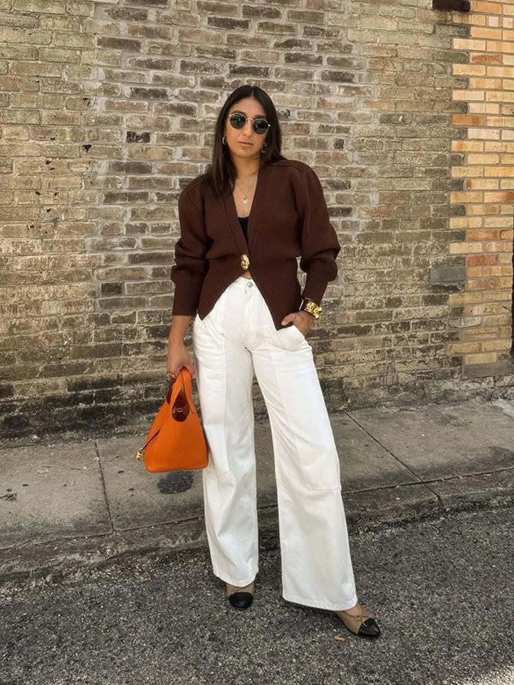 Bu sofistike V yaka hırka, minimalizmi zarafetle birleştiriyor. Altın rengi düğmesi ve rahat kesimi ile yüksek ama zahmetsiz bir görünüm için mükemmel bir seçimdir. Zamansız bir stil için etek veya pantolonla eşleştirin.