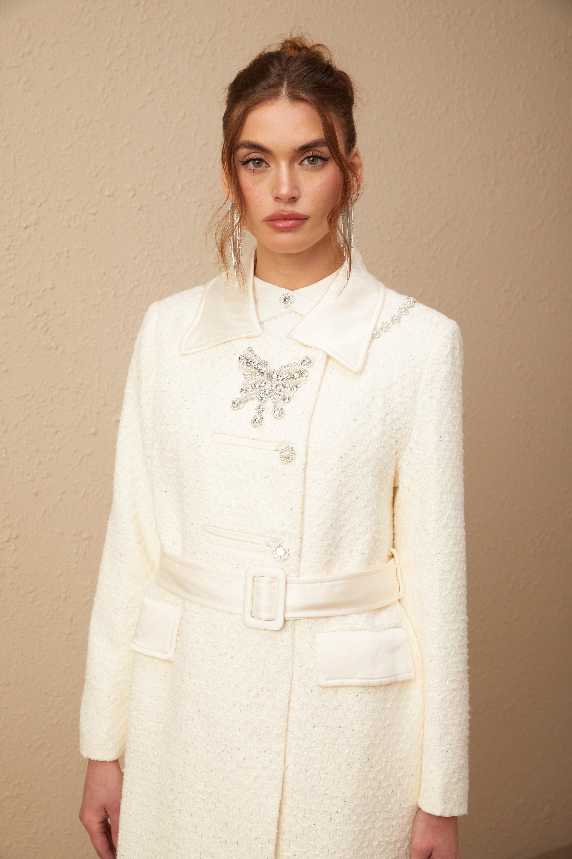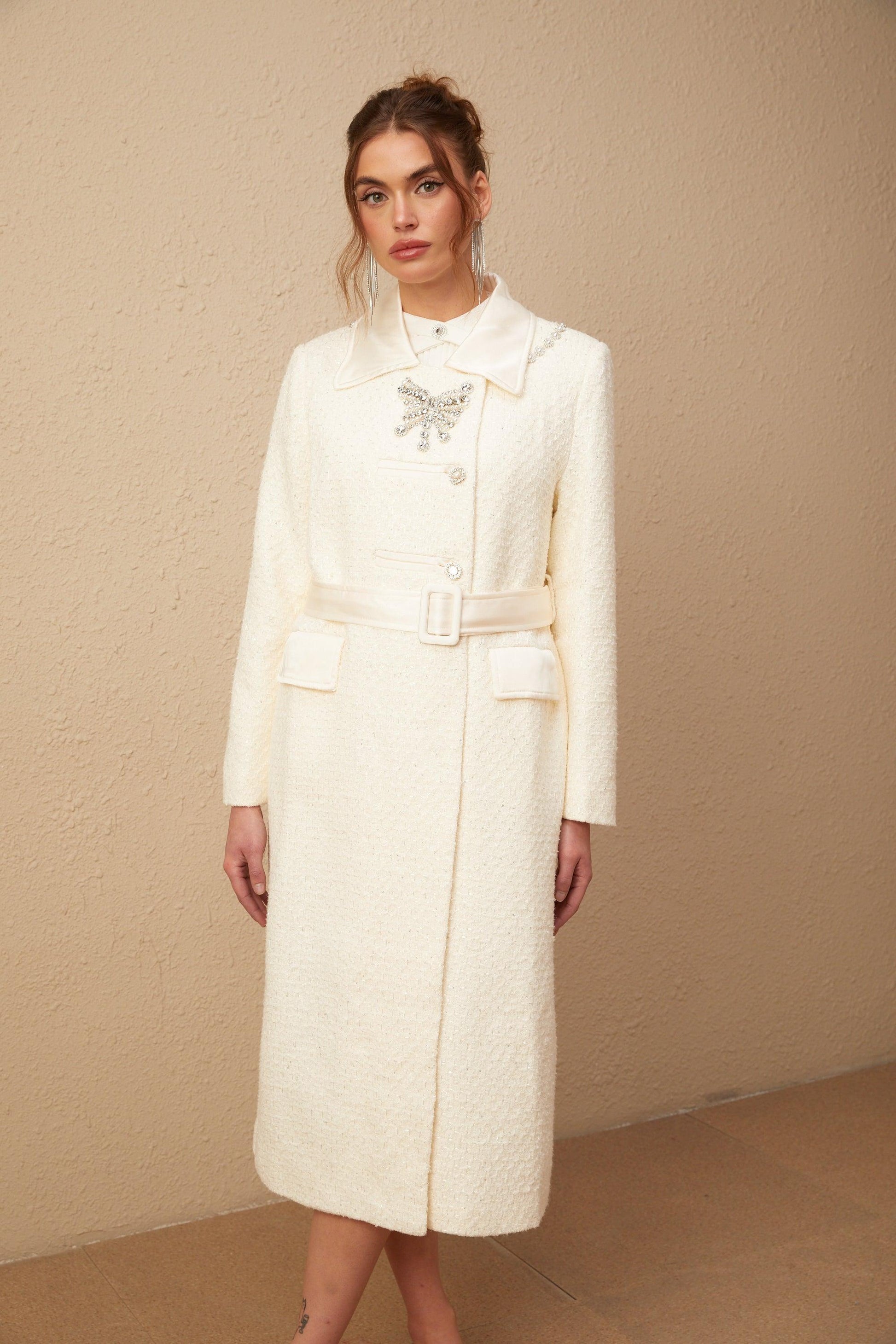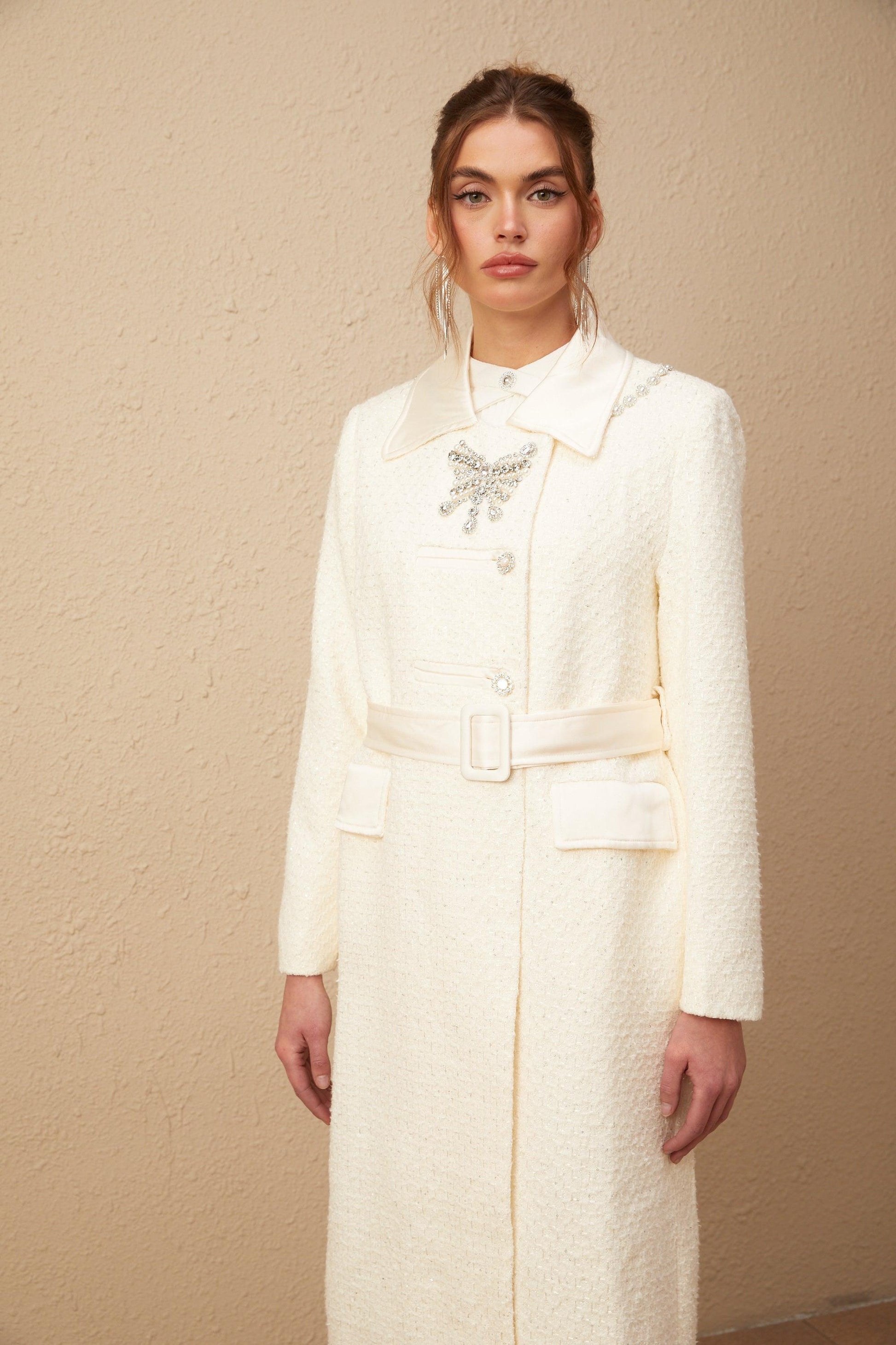"Eternal Grace" kaban, zarif beyaz dokusu, ince kuşak detayı ve göz alıcı taş işlemeleriyle kış şıklığınıza sofistike bir dokunuş katıyor. Modern silueti ve zarif tasarımıyla özel davetlerden günlük kullanıma kadar her ortamda stilinizi tamamlar.