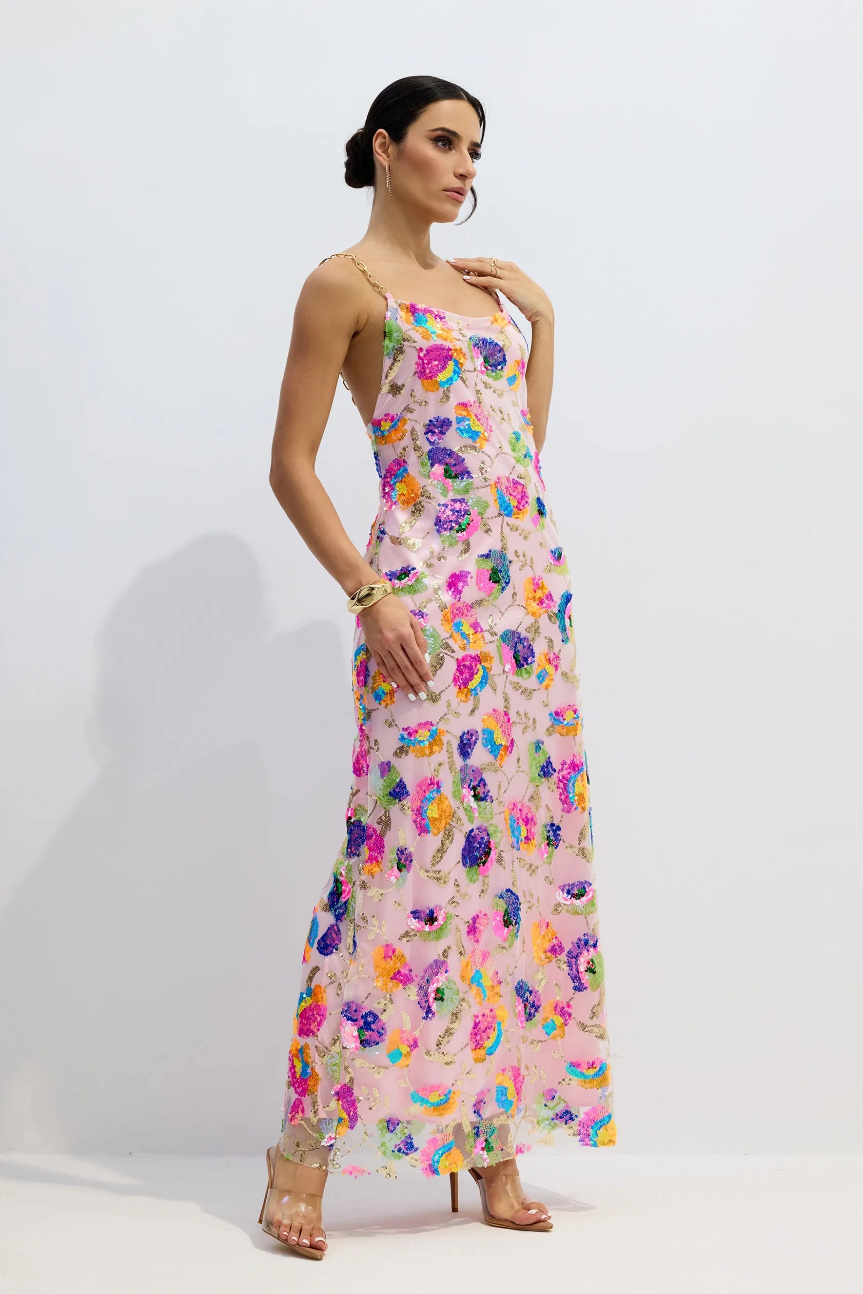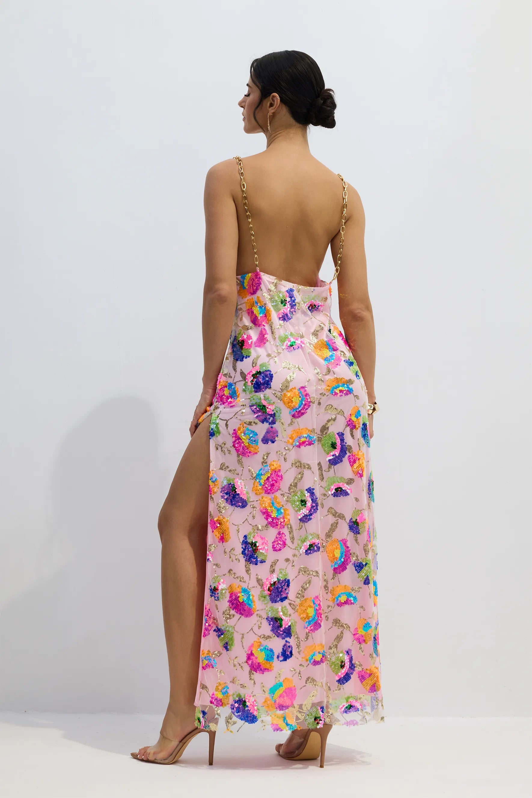 Fanny İşlemeli Payetli Sırtı Açık Uzun Elbise