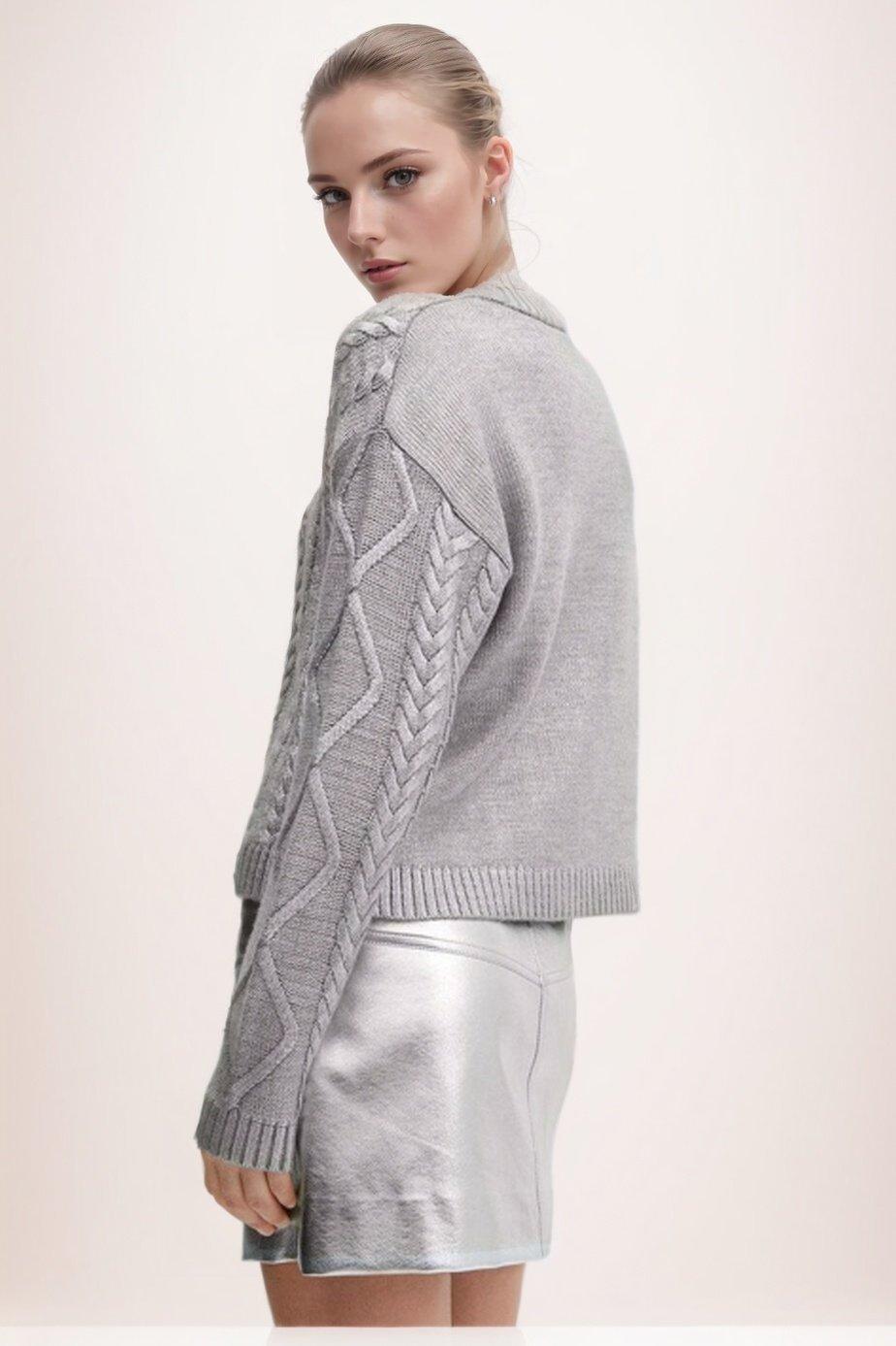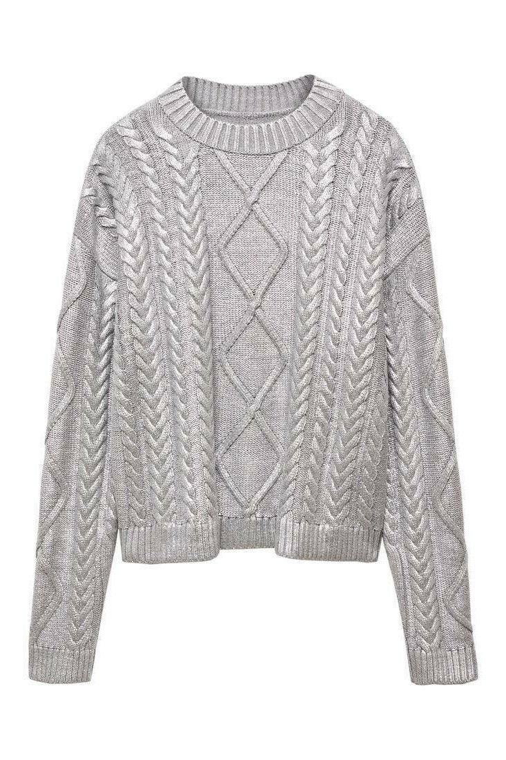 Bu lüks triko üst, klasik kablo örgü tasarımıyla metalik folyolu bir dokuya sahiptir. Uzun kollu ve yuvarlak yakalı, rahatlık ve esneklik için yüksek esnekliğe sahip, rahat bir kesim sunar. Kazak tarzı giyim kolaylığı sağlarken, özel folyo tekniği hafif dökülmelere neden olabilir. Gardırobunuza gösterişli bir dokunuş katmak için mükemmel olan bu üst, kot pantolon veya eteklerle zahmetsizce eşleşerek şık, göz alıcı bir görünüm sağlar.