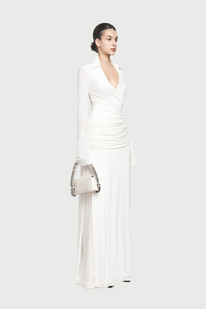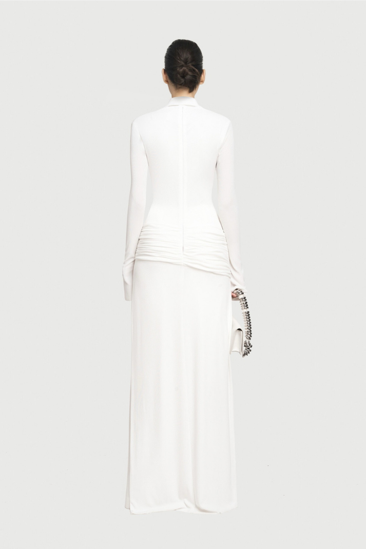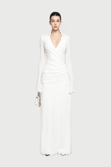 Zarafeti modern bir yorumla buluşturan bu beyaz maxi elbise, derin V yaka kesimi ve drapeli bel detaylarıyla feminen bir silüet yaratıyor. Uzun kolları ve hafif dökümlü eteğiyle akışkan bir görünüm sunarken, şıklığı ön plana çıkarıyor. Hem davetlerde hem özel günlerde sofistike bir duruş sergilemek isteyenler için ideal.