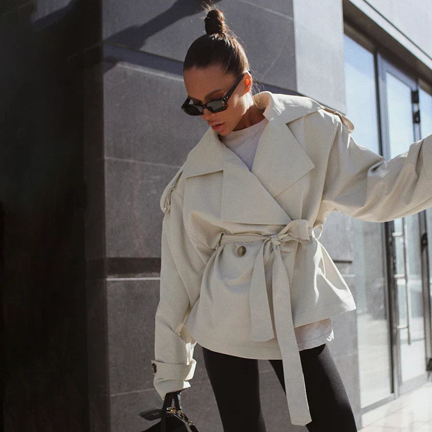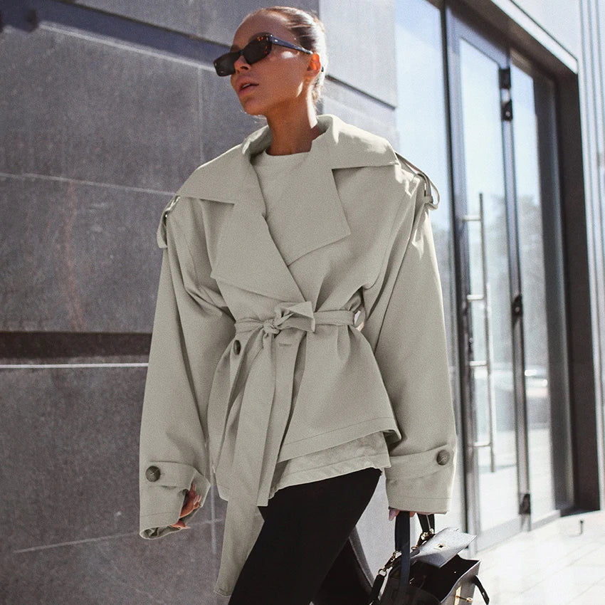 Büyük düğme ve apolet detayları klasik trençkot şıklığını yansıtır.