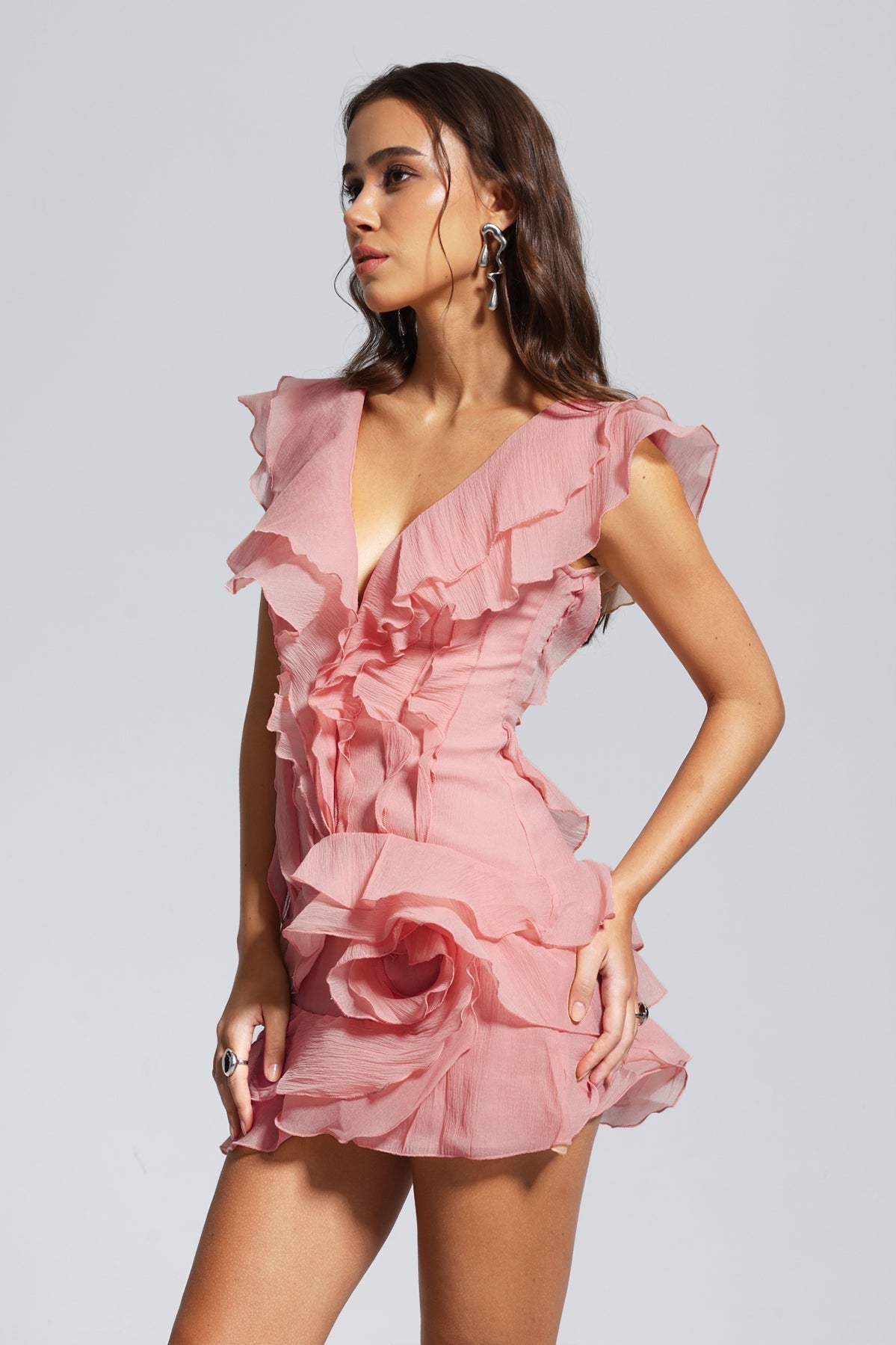 Maura V Yaka Fırfırlı Asimetrik Mini Elbise Pembe