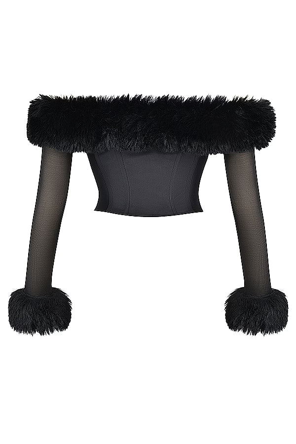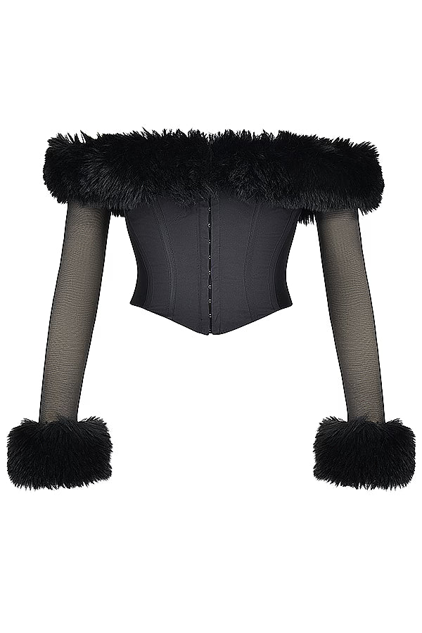 Bu siyah korsaj üst, cesur ve sofistike görünümüyle öne çıkıyor. Omuz ve bileklerdeki sahte kürk detayları dramatik bir şıklık katarken, korse formu vücudu sararak feminen silueti vurguluyor. Jeanlerle günlük şıklık, etek veya deri pantolonlarla gece stilinde iddialı bir tercih olabilir.