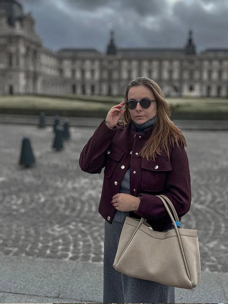 Bu özel dikim bordo ceket, hem dayanıklılık hem de rahatlık sunan yüksek kaliteli, orta ağırlıkta bir kumaştan üretilmiştir. Yapılandırılmış tasarım, keskin hatlar ve güçlendirilmiş dikişlerle zenginleştirilmiş düz bir kesime sahiptir. Altın tonlu metalik düğmeler, koyu bordo rengine çarpıcı bir kontrast sağlayarak sofistike bir dokunuş katar. Fonksiyonel unsurlar arasında pratiklik için iki adet kapaklı ön yama cebi ve gösterişli bir görünüm için düğmeli kapama bulunur. Geçiş mevsimleri için ideal olan bu ceket, çok yönlü bir gardırop elyafı için klasik estetiği modern detaylarla birleştiriyor.
