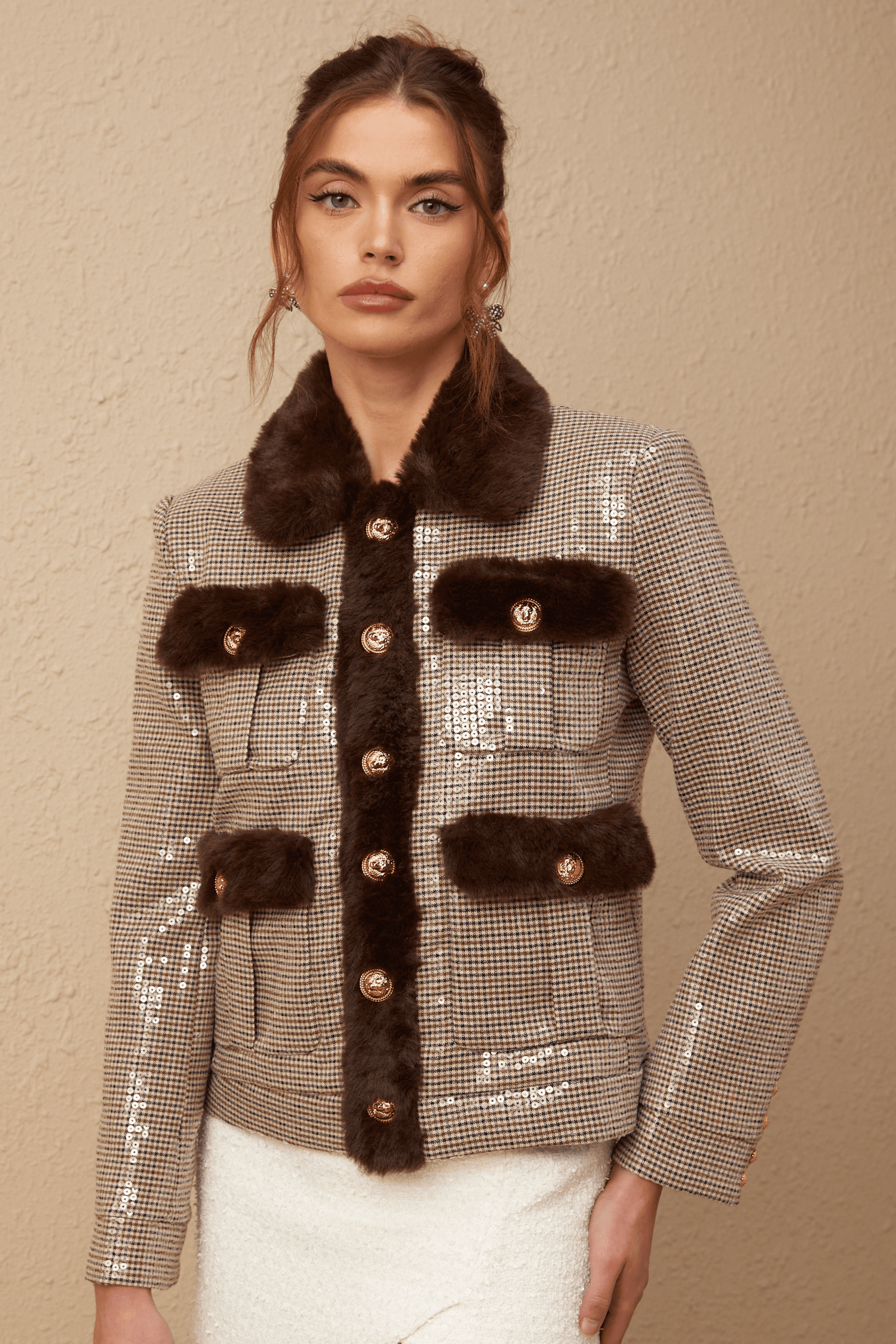 Nova ceket, kareli deseni ve kürk detaylarıyla klasik şıklığı modern bir dokunuşla sunuyor. Altın düğmeleri ve zarif işlemeleriyle, soğuk havalarda stilinizi tamamlayan eşsiz bir parça.