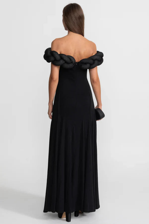 Koyu Kırmızı Omuzsuz Örgülü Yakalı Maxi Elbise