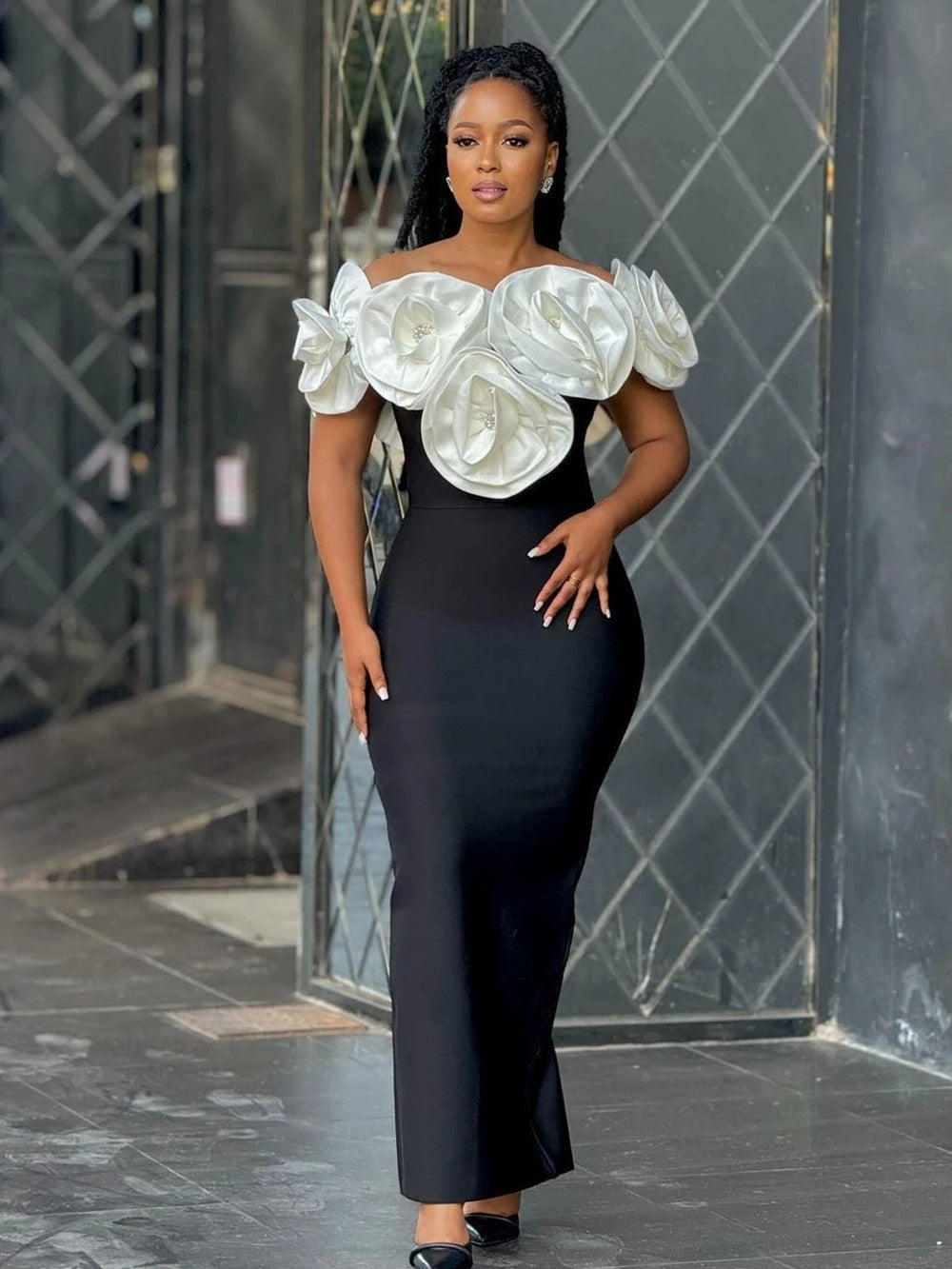 Özel davetlerin en şık kadını olmaya hazır olun! 💖 Bu siyah, omuzları açık abiye elbise, üzerindeki büyük 3D çiçek detaylarıyla göz kamaştırıyor. ✨ Vücuda oturan yapısı, zarif silüetinizi vurgular. Balo, düğün, nişan gibi özel günler için ideal. 🌸🖤