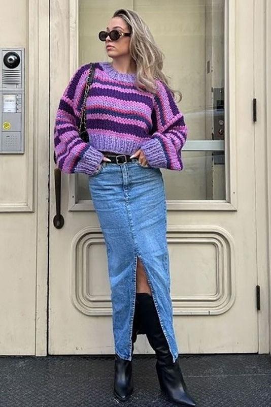 Klasik yuvarlak yakalı, uzun kollu, çizgili örgü kazaklarımızla gündelik tarzınızı yükseltin. Bu kazak kazak, gün boyu konfor ve zahmetsiz şıklık sağlayan rahat ve bol bir kesim sunar.