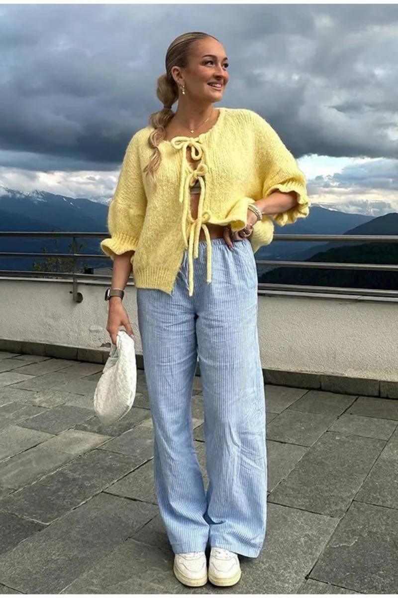 Chanel'den ilham alan şık bir tarzda tasarlanan örgü hırkamızla zamansız inceliği keşfedin. Bu zarif kazak, klasik yuvarlak yakalı ve tek sıra düğmeli olup, geleneksel çekiciliği modern zarafetle harmanlamaktadır.
