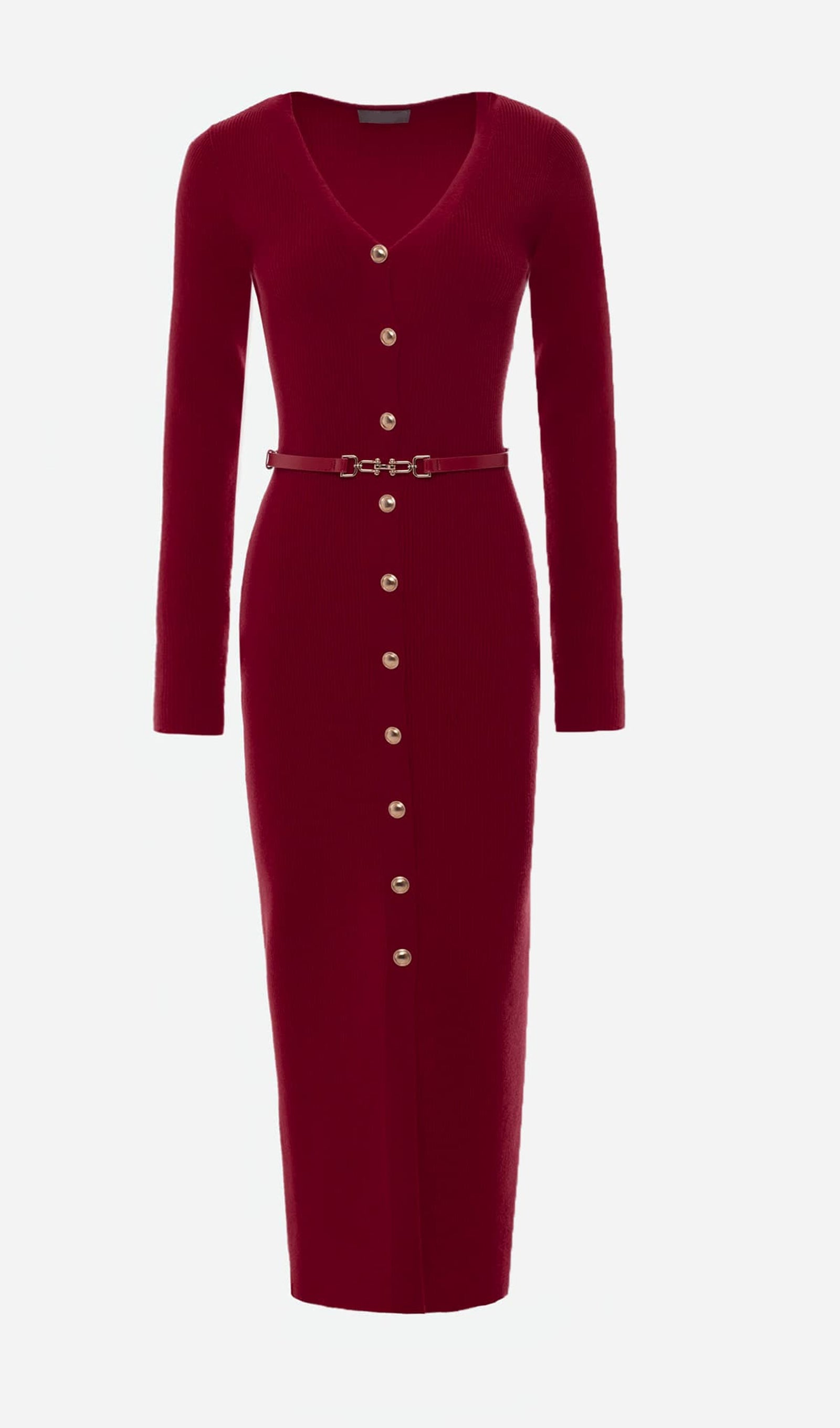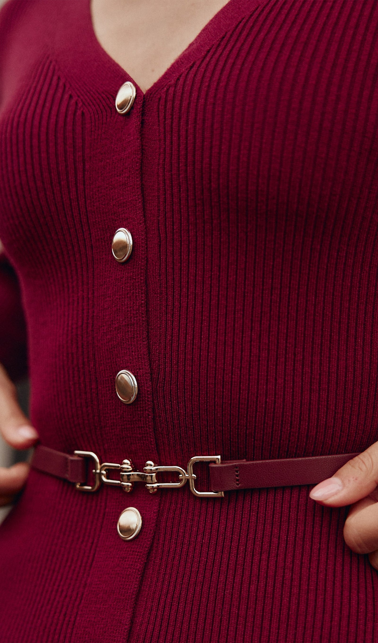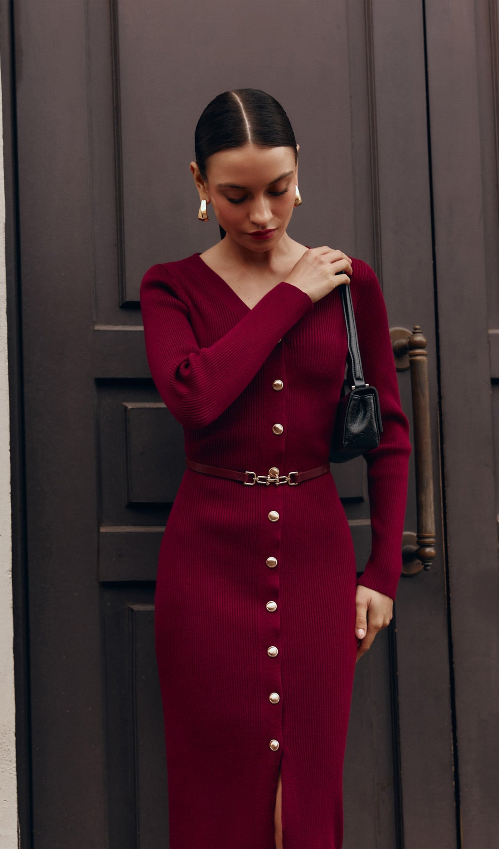 Zamansız şıklığın modern yorumu… V yaka detayı ve inci görünümlü düğmeleriyle zarif bir silüet sunan bordo knit midi elbise, günlük stilinizden akşam davetlerinize kadar her anınıza eşlik edecek. Belden ince kemer detayıyla feminenliği ön plana çıkarır.